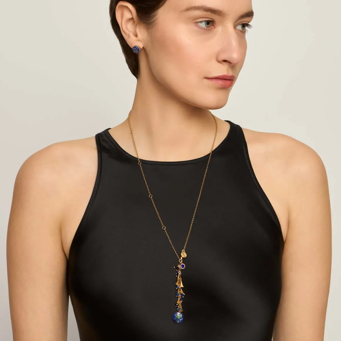 Długi łańcuch z pozłacanego srebra ozdobiono licznymi, drobnymi zawieszkami z fasetowanych onyksów, lapisów lazuli oraz geometrycznych elementów z pozłacanego mosiądzu, które tworzą bogatą i dynamiczną kompozycję. W górnej części zawieszki umieszczono okrągły element z fasetowanym kundan glass w odcieniu indygo – wysokiej jakości indyjskim szkłem, które efektownie rozprasza światło przy każdym ruchu. Dolną część wieńczy największa, emaliowana zawieszka minakari, bogato zdobiona motywami florystycznymi. Z jednej strony, dzięki ozdobom wykonanym z czarnej emalii, jest subtelna, elegancka i stonowana. Z drugiej zachwyca niebiesko-zielonymi ornamentami, w których widoczne są charakterystyczne dla techniki minakari warstwowość i delikatne przejścia barw. Brzegi zawieszki dopełnia pas czarnej emalii, podkreślający jej dekoracyjny charakter.
