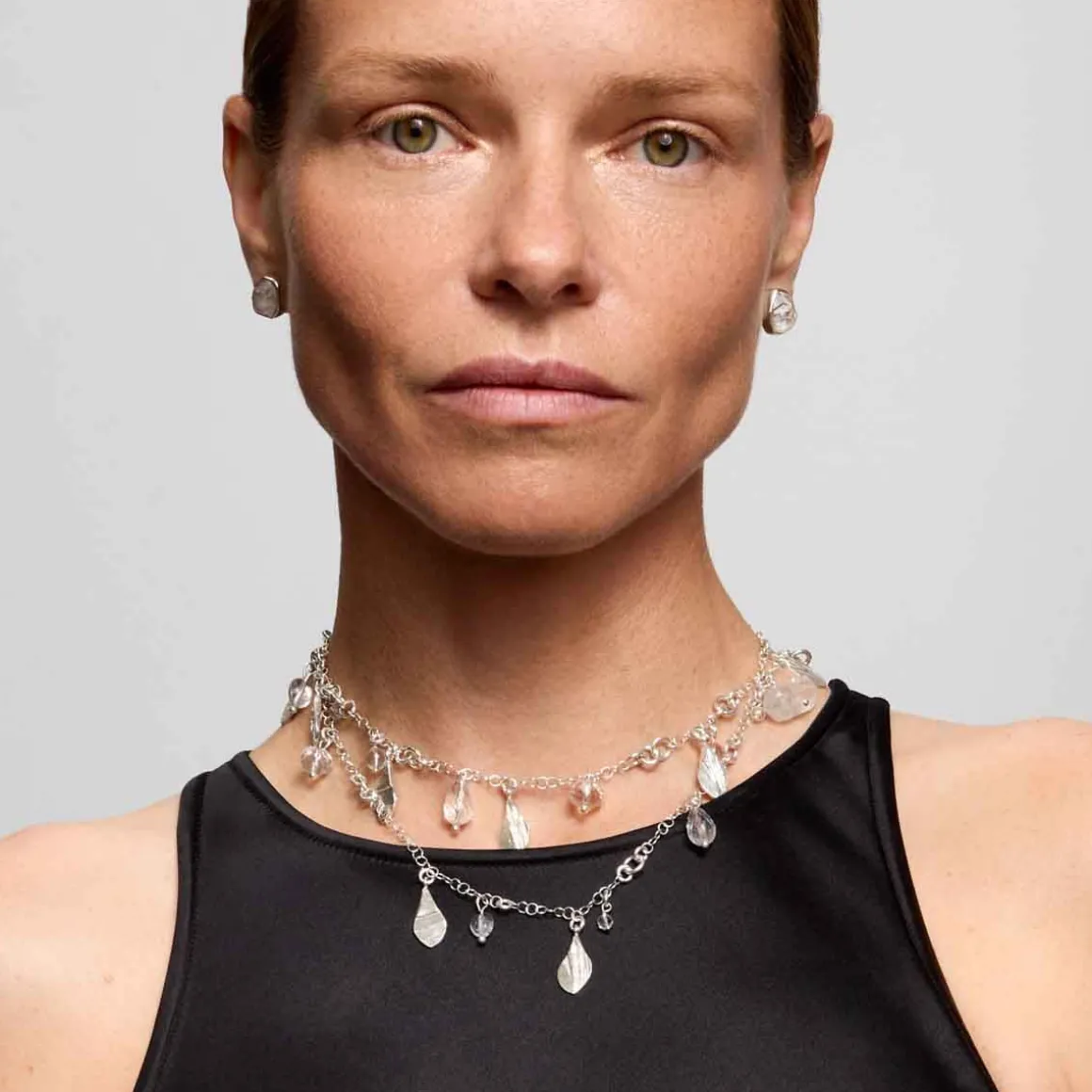 Długi naszyjnik z kolekcji Aurora został wykonany ręcznie ze srebra próby 925. Drobne oczka łańcuszka przeplatają się z nieco większymi oczkami tworząc ciekawą, asymetryczną kompozycję, dodatkowo ozdobioną kryształami górskimi oraz herkimerami. Transparentne korale przyciągają uwagę diamentowym blaskiem, a niekiedy także barwnymi inkluzjami, które czynią każdy egzemplarz unikatowym. Całość dodatkowo ozdobiona jest srebrnymi zawieszkami o nieregularnej fakturze inspirowanej surowym, łupanym turmalinem, które przywołują skojarzenia z dzikością natury i jej pierwotnym pięknem. Ta biżuteria łączy subtelność i surowość – symbolizuje spotkanie światła zaklętego w kryształach z siłą ziemi, utrwaloną w fakturze srebra.