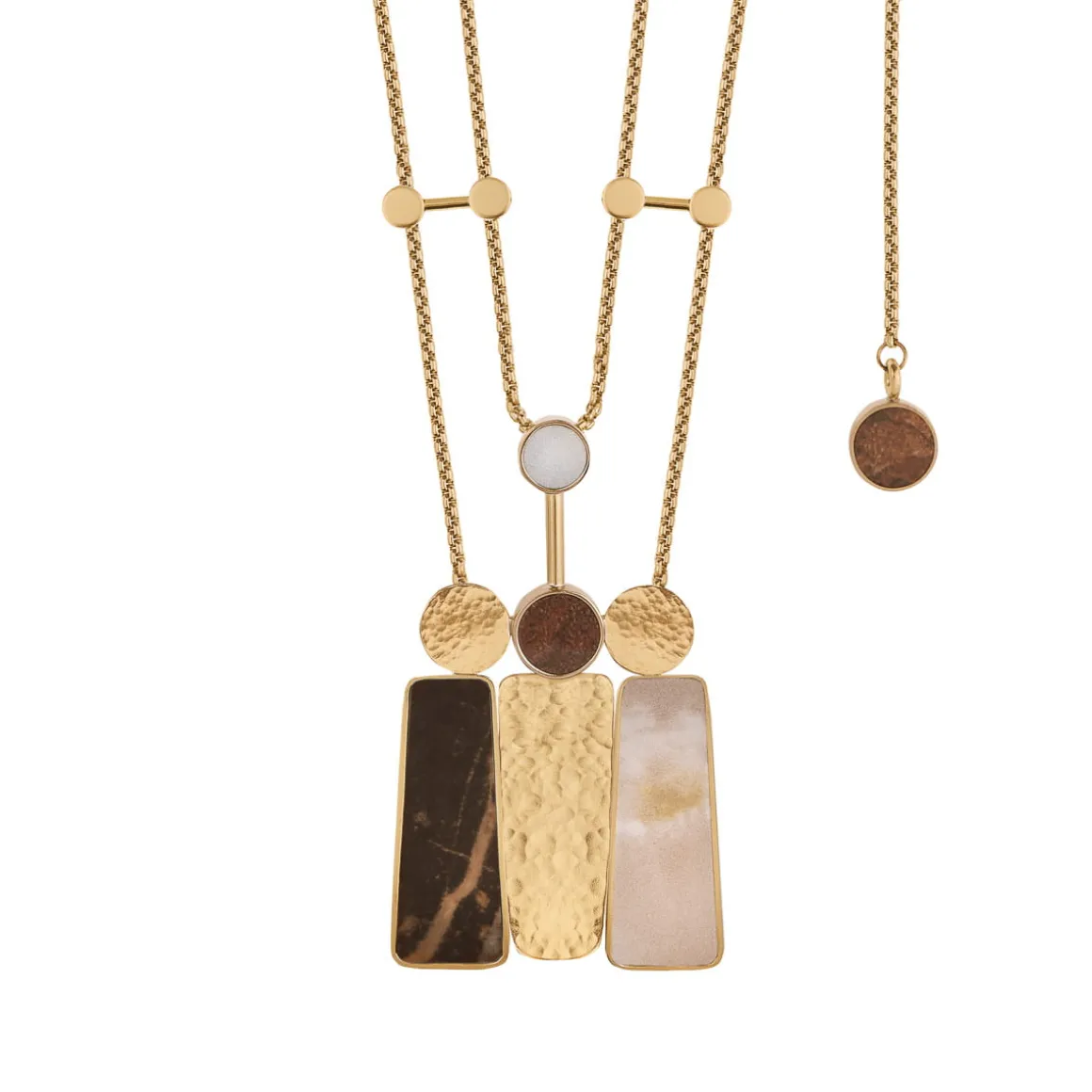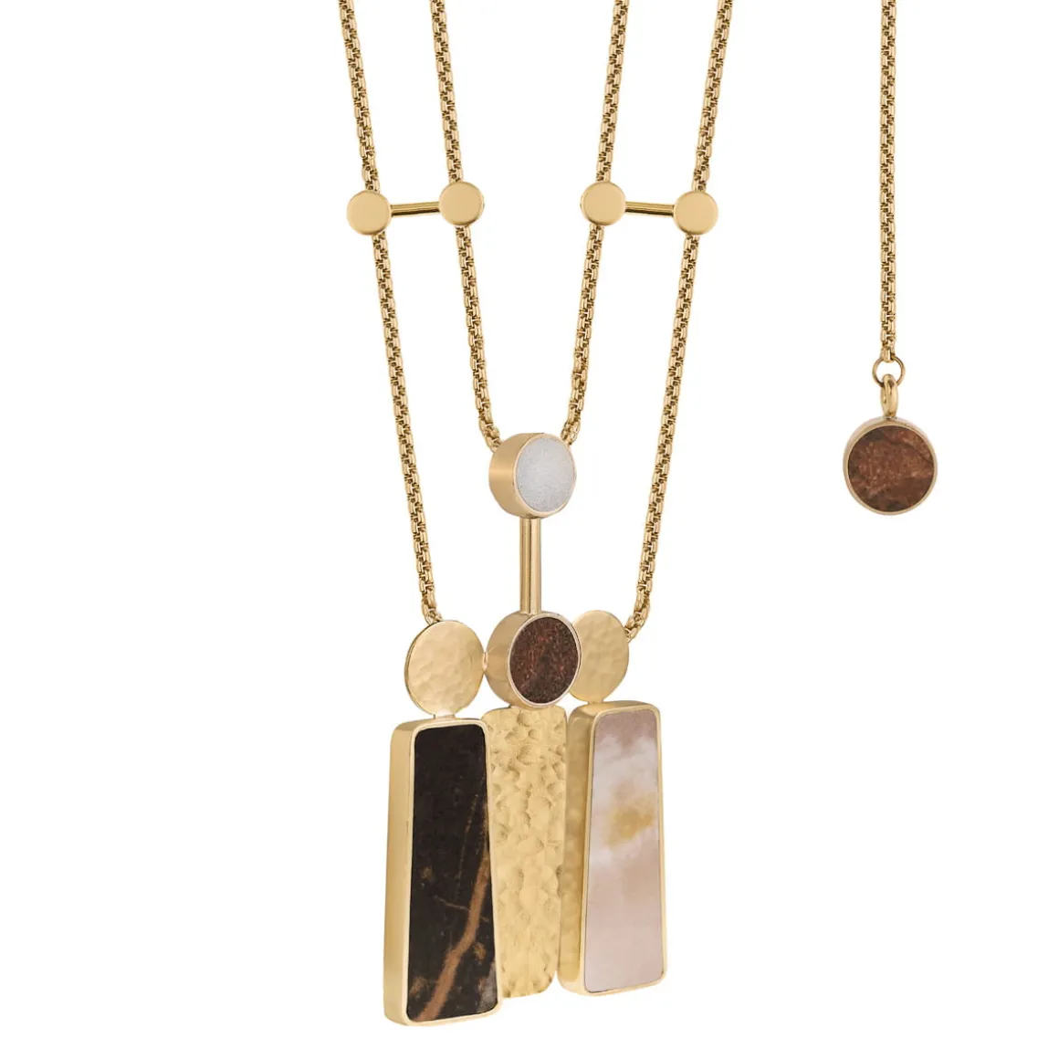 Naszyjnik został wykonany ręcznie. Składa się z podwójnego łańcuszka o splocie kostki oraz oryginalnego wisiora będącego połączeniem ceramiki i mosiądzu. Kruchy, acz wytrzymały materiał nie wybacza pośpiechu, dlatego szlifowanie jednego elementu wymagało cierpliwości i czasu. Proces ten przypominał fasetowanie naturalnych minerałów i by go poprawnie wykonać, potrzebna była jednakowa precyzja. Tak przygotowane elementy połączono z geometrycznymi, pozłoconymi elementami. Jubilerzy ORSKA w artystyczny sposób zestawili przeciwności: kutą, nieregularną powierzchnię metalu z elementami o satynowym wykończeniu. Geometryczne, minimalistyczne formy nadają całości industrialnego charakteru. Całość uzupełnia kilkucentymetrowa przedłużka z logo ORSKA oraz zapięcie na karabińczyk.