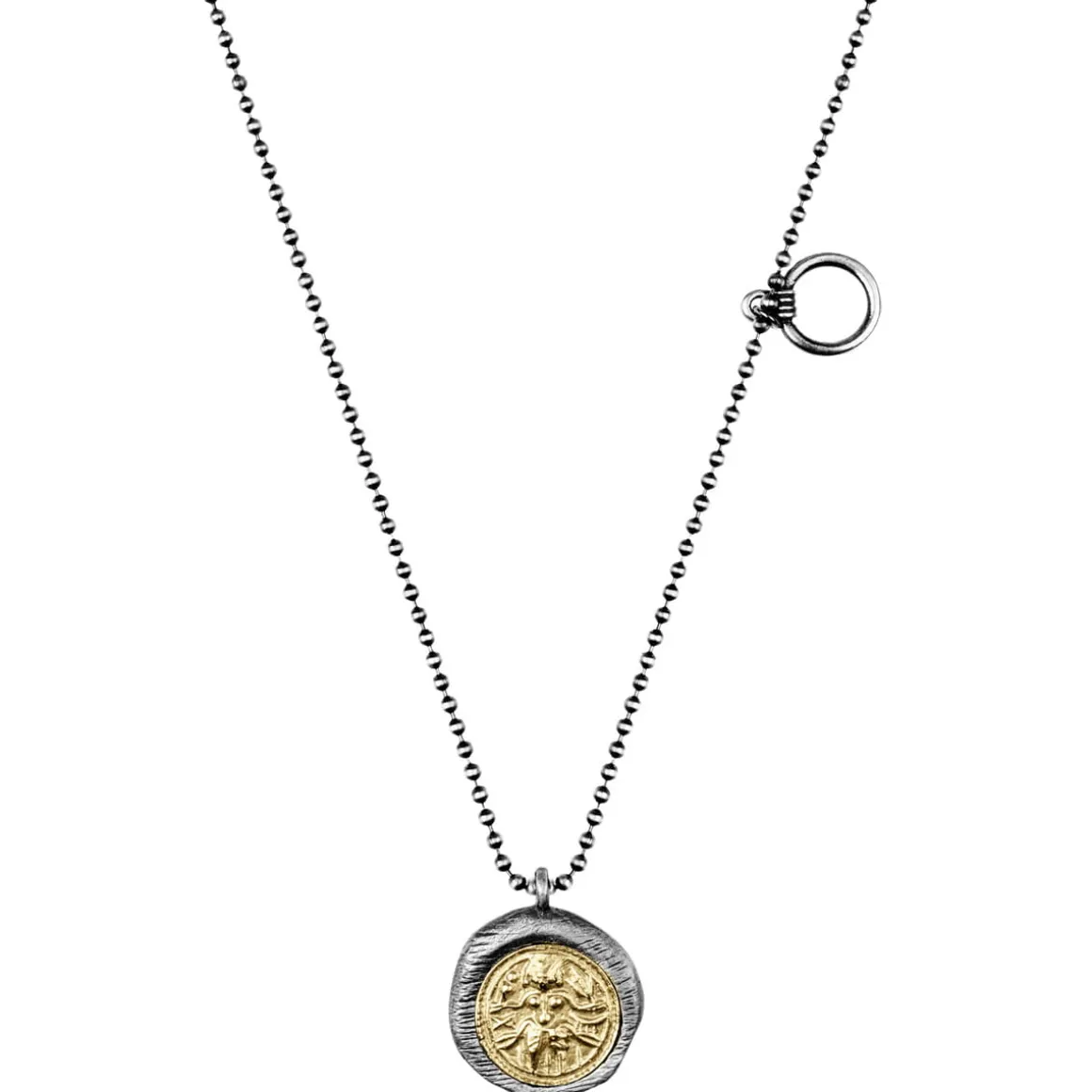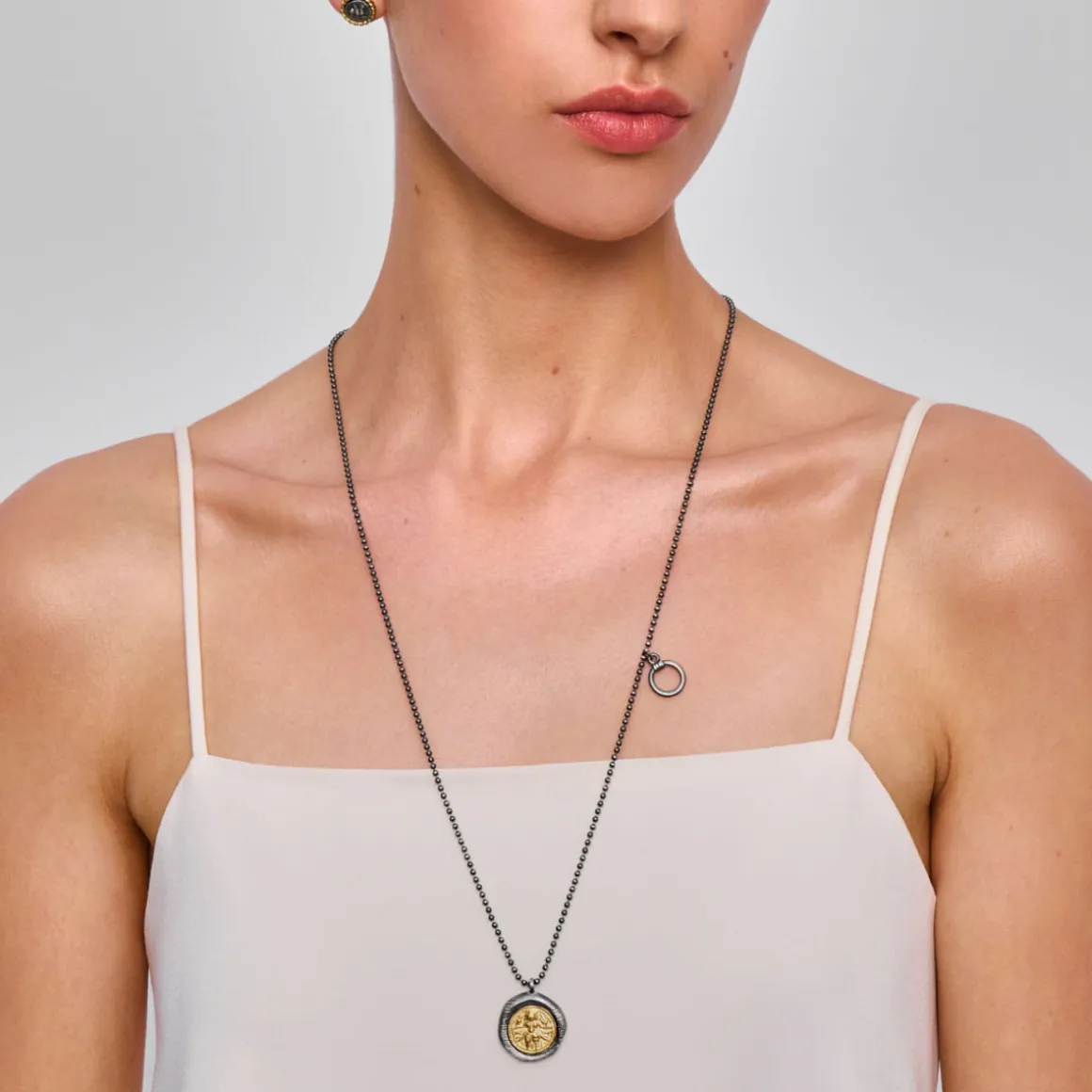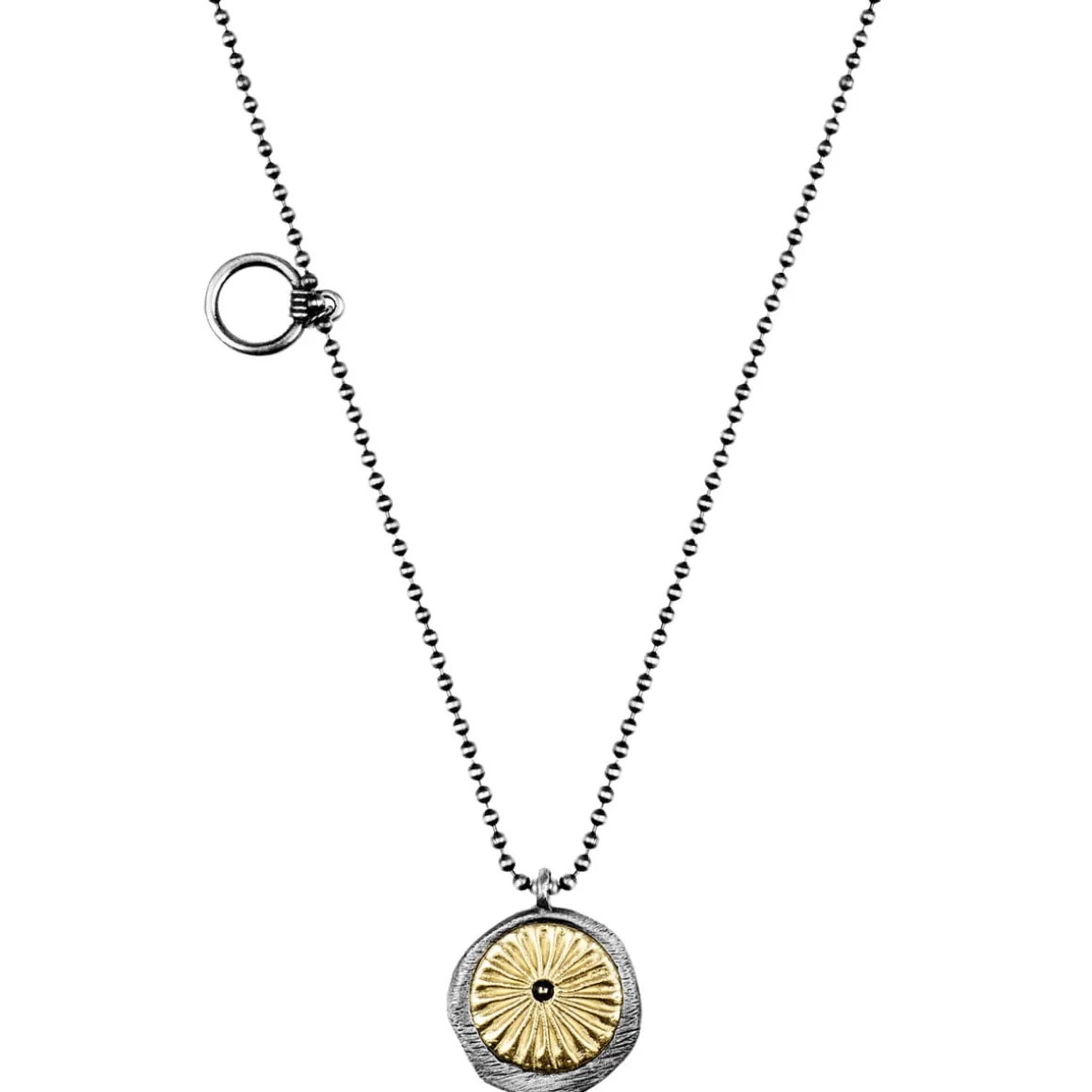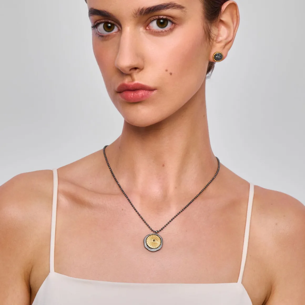 Naszyjnik wykonaliśmy ręcznie w pracowni jubilerskiej ORSKA ze srebra próby 925. Delikatny kulkowy łańcuszek ozdobiliśmy zawieszką w kształcie pieczęci, w której odcisnęliśmy autorski symbol słońca. Ta uniwersalna metafora siły życiowej, odnowy i mocy stwórczej, kojarzona jest nie tylko z bogami solarnymi (np. Ra, Apollo, Sol), ale też z duchowym oświeceniem. Symbol słońca wykonaliśmy z pozłacanego mosiądzu. Rewers zawieszki ozdobiony jest medalionem z symbolem kobiecego bóstwa. Przedstawiona bogini ma kilka ramion, które podkreślają jej boską moc i zdolność do walki ze złem. To symbol o wielowarstwowym znaczeniu – obecny niemal we wszystkich kulturach świata. Jego interpretacja zależy od kontekstu kulturowego, ale zawsze łączy się z mocą twórczą, siłą wewnętrzną i duchową obecnością kobiecości. Całość naszyjnika dopełnia delikatna zawieszka w kształcie okręgu, przyczepiona nieco nad główną zawieszką oraz logo ORSKA.