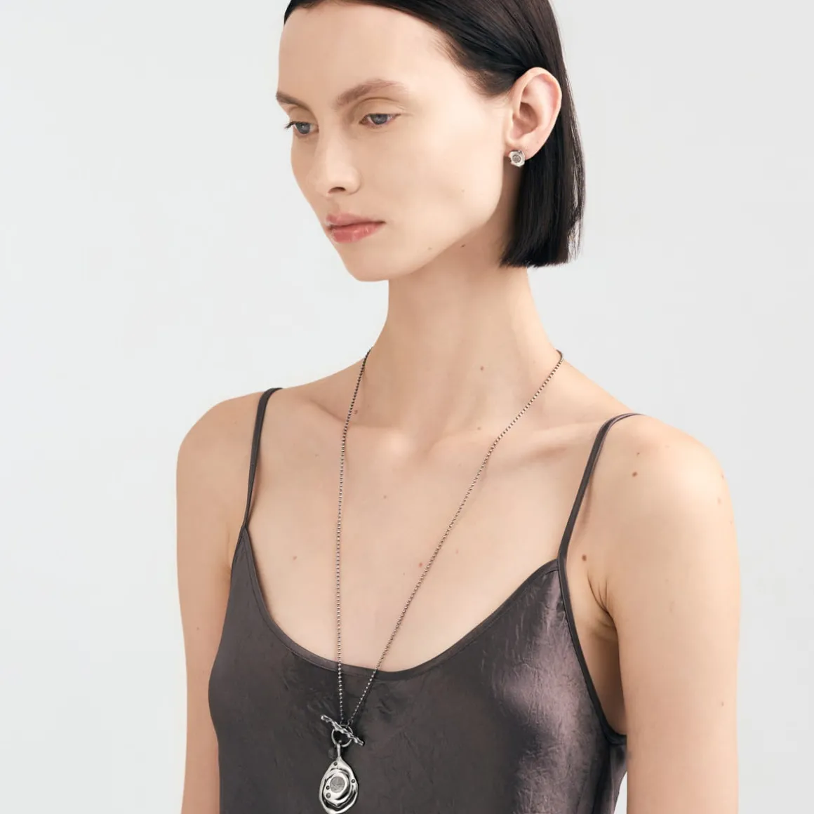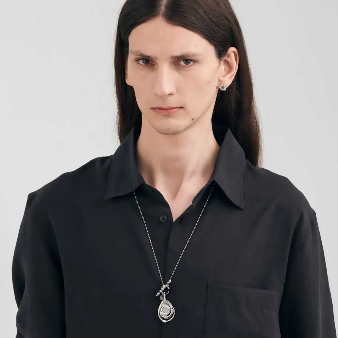 Naszyjnik z kolekcji Meteoros łączy kosmiczny pierwiastek z nowoczesnym designem. Na kulkowym łańcuszku powiesiliśmy medalion, ręcznie wykonany w naszej pracowni ze srebra próby 925. Zawieszka ma nieregularny, miękki kształt przywołujący skojarzenia z tajemnicami wszechświata – przypomina spiralę galaktyki, składającą się z gwiazd, pyłu kosmicznego i ciemnej materii. W centrum zawieszki osadzony jest fragment meteorytu Aletai, otoczony błyszczącymi pirytami, których chłodne tony współgrają z barwą metalu. Surowa, srebrzystoszara faktura meteorytu podkreśla jego nieziemskie pochodzenie, a całość dopełnia zapięcie typu skobel, które unieśliśmy z przodu naszyjnika. Naszyjnik harmonijnie łączy naturalne materiały z precyzyjnym rzemiosłem, tworząc idealny dodatek, który sprawdzi się zarówno w codziennych, jak i bardziej formalnych stylizacjach. Jest oryginalny i nieszablonowy.