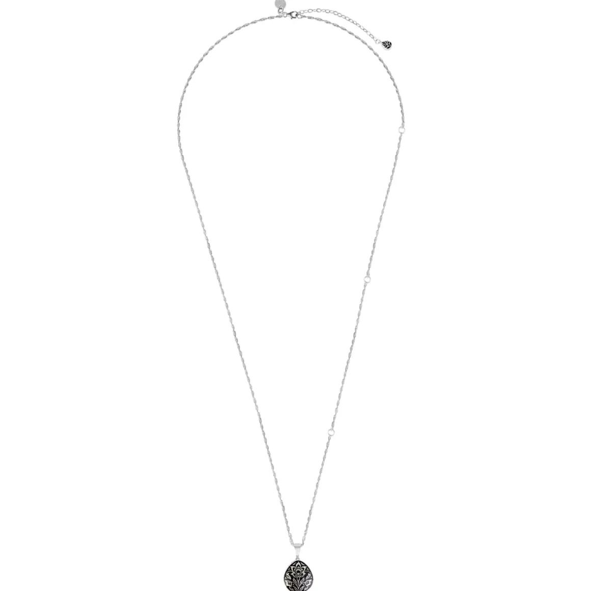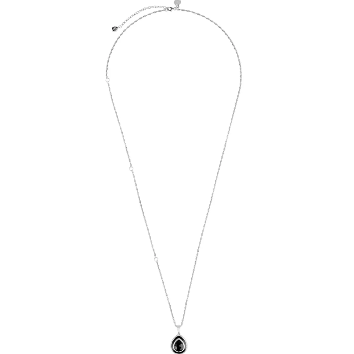 Długi naszyjnik z jasnego srebra na łańcuszku o spiralnym splocie zdobi zawieszka w kształcie łezki. Zawieszka jest dwustronna – z jednej strony zdobi ją centrycznie ułożone czarne kundan glass, czyli tradycyjne indyjskie szkło, otoczone zdobieniami ze srebra oraz czarnej emalii. To strona elegancka, stonowana, pełna tajemnicy. Druga strona zawieszki odsłania misterne floralne zdobienia wykonane ręcznie przez lokalnych rzemieślników: czarno-srebrne ornamenty roślinne. Naszyjnik można zapiąć na kilku wysokościach. Biżuteria dodatkowo posiada przedłużkę, zakończoną niewielką zawieszką obustronnie zdobioną roślinnymi wzorami.