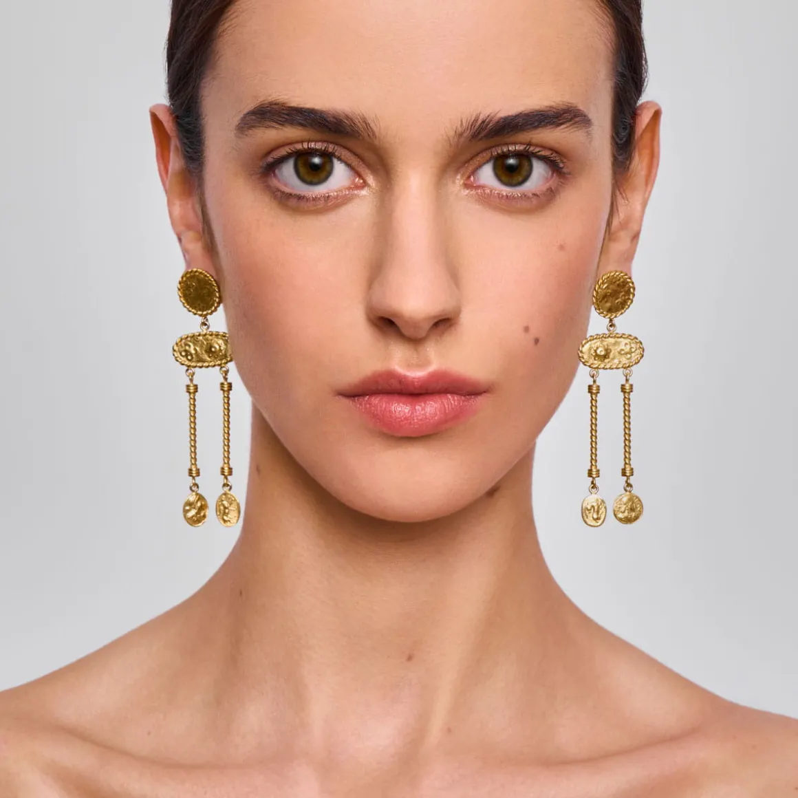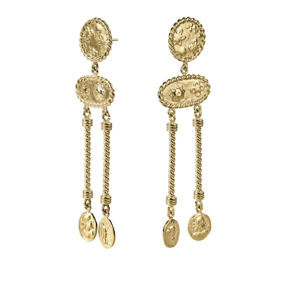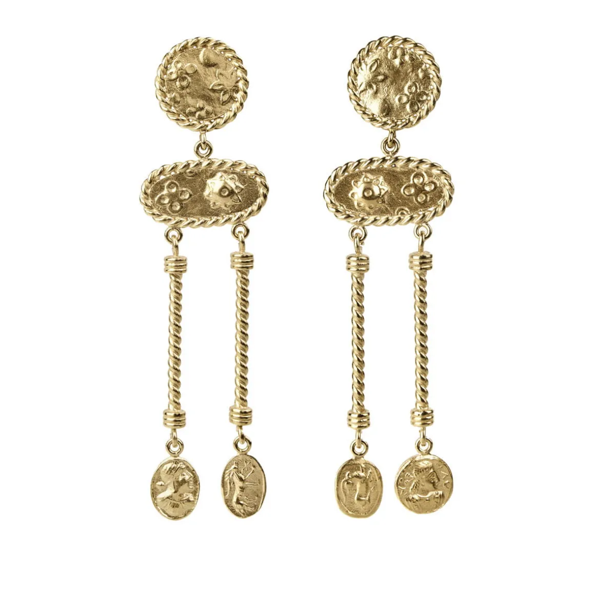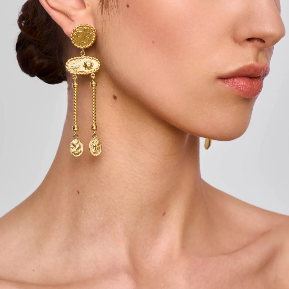 Kolczyki zostały wykonane ręcznie z pozłacanego mosiądzu. Górne elementy przypominają odciśnięte pieczęcie z ozdobnymi ornamentami, a dolne zakończenia wieńczą owalne medaliony. Na nich zobaczyć można wytłoczone postaci władców i mitologicznych stworzeń, przywodzące na myśl fragmenty monet lub pieczęci. W zależności od konkretnej pary, układ medalionów i wizerunki na nich mogą się różnić od egzemplarza prezentowanego na zdjęciu, a na zawieszkach można zamiennie spotkać postaci różnych władców, Koziorożców i gryfów. Kolczyki są lekkie mimo swojej rozbudowanej formy, a ich dynamiczna budowa sprawia, że łapią światło i przyciągają wzrok przy każdym poruszeniu głową.