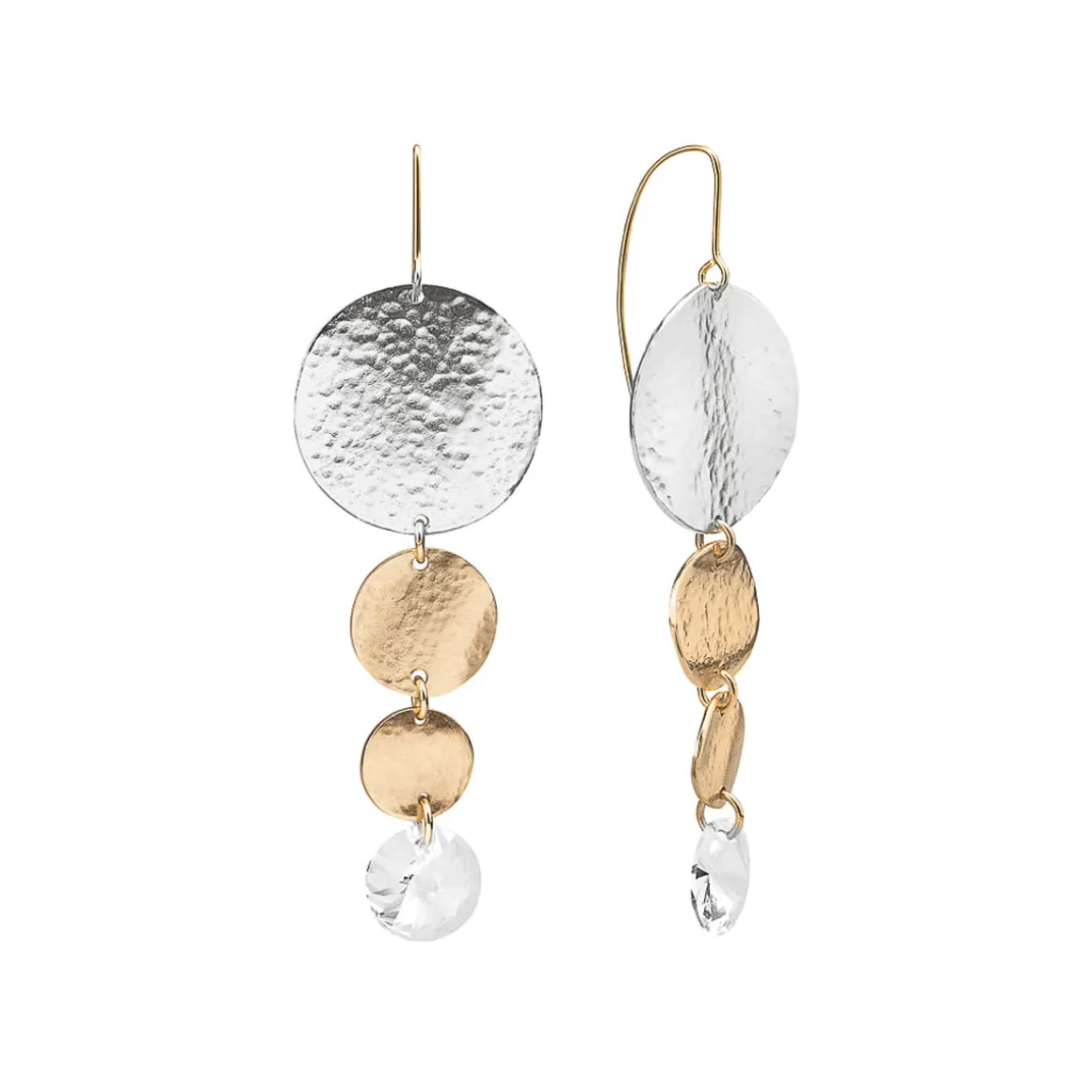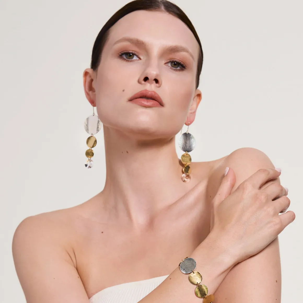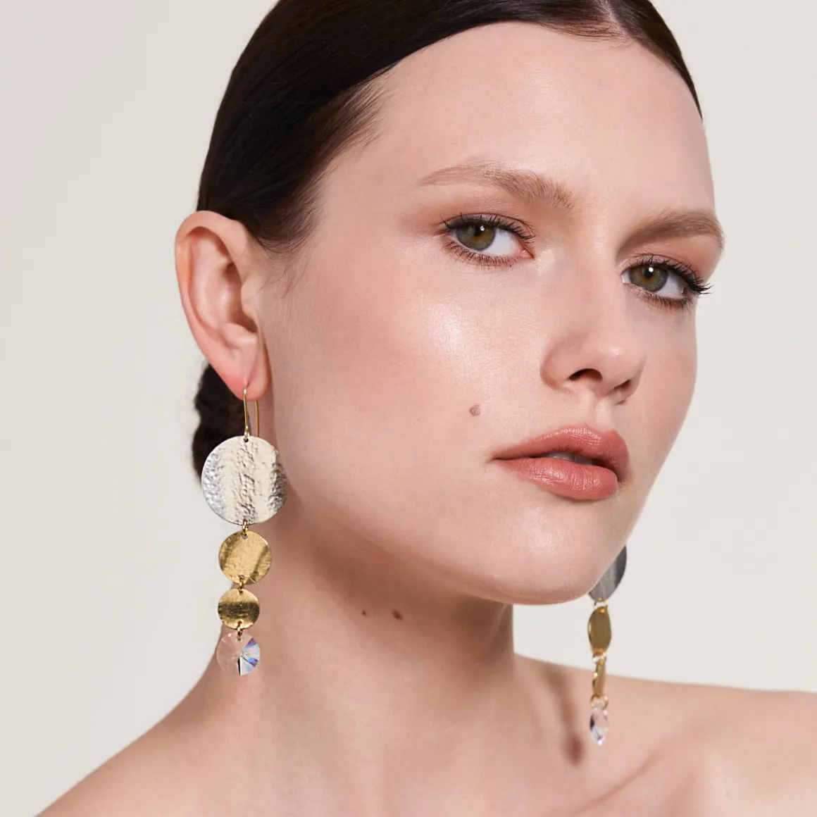 Kolczyki powstały dzięki ręcznej pracy jubilerów w warsztacie ORSKA. Każdy z kolczyków składa się z trzech metalowych plastrów: srebrnego i dwóch wykonanych z pozłacanego mosiądzu. Kompozycję wieńczy fasetowany kryształ. Elementy zostały połączone drobnymi ogniwami, które nadają całości lekkości. Ułożone od największego do najmniejszego w harmonijną kompozycję, podkreślają twarz i szyję. Falowana powierzchnia przypomina rozkołysaną falę morską, a okrągłe formy o ręcznie kutej powierzchni nawiązują do kręgów na zmąconej wodzie. Dzięki uniwersalnemu charakterowi i eleganckiej formie kolczyki będą świetnym uzupełnieniem zarówno codziennych jak i wieczorowych kreacji.