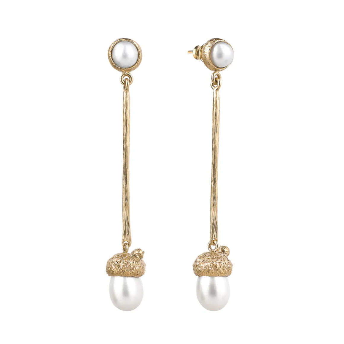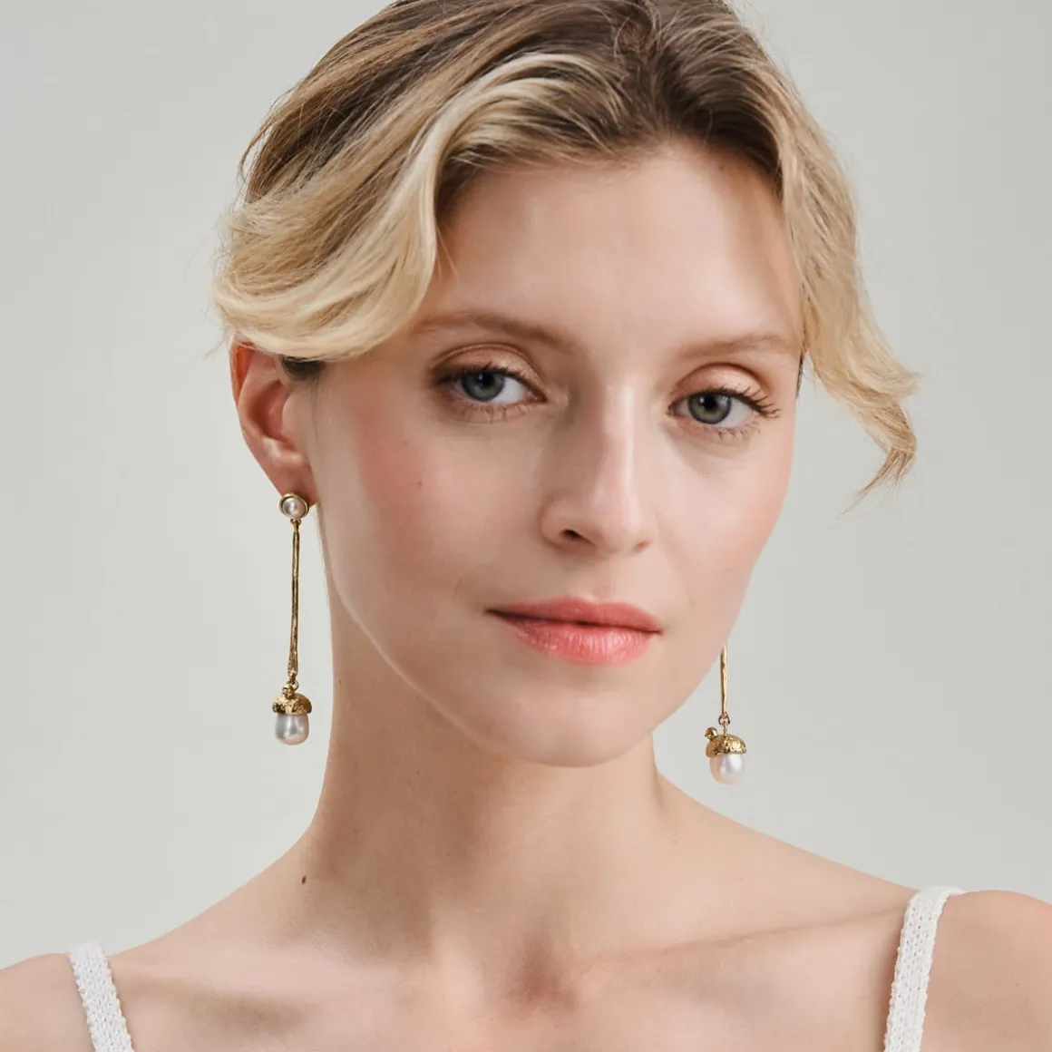 Biżuteria została wykonana ręcznie w pracowni ORSKA. Kolczyki składają się z odlanych z mosiądzu i pozłoconych form żołędzi oraz dębowych gałązek, które umieszczono na srebrnych sztyftach. Całość uzupełniają naturalne perły w pozłacanej oprawie. Złoty kolor współgra z kremowymi klejnotami, przywołując skojarzenia ze śniegiem skrzącym się w słonecznym blasku. Kolczyki sprawdzą się u osób, które chcą postawić biżuteryjną kropkę nad “i” w codziennych i odświętnych stylizacjach. W kolekcji Bery odnajdziesz także pasujące naszyjniki z motywem żołędzia – razem utworzą komplet obok którego nie da się przejść obojętnie.