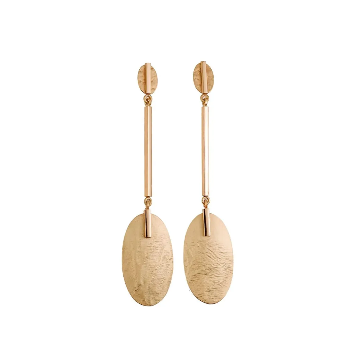 Artystyczne kolczyki na sztyfcie z kolekcji Moon zostały ręcznie wykonane z pozłacanego mosiądzu. Owalne płaszczyzny, pod wpływem wysokiej temperatury, przyjęły niepowtarzalną strukturę zagięć, która przywodzi na myśl krajobraz księżycowy. Powierzchnia wiszących kolczyków posiada satynowe wykończenie. Nowoczesnego sznytu dodają im proste, podłużne elementy wykończone na wysoki połysk. Oryginalny design najlepiej prezentuje się w towarzystwie innych wzorów z tej samej kolekcji. Pozostaje więc tylko wybrać wielkość konstelacji, aby stworzyć własny Układ Słoneczny.