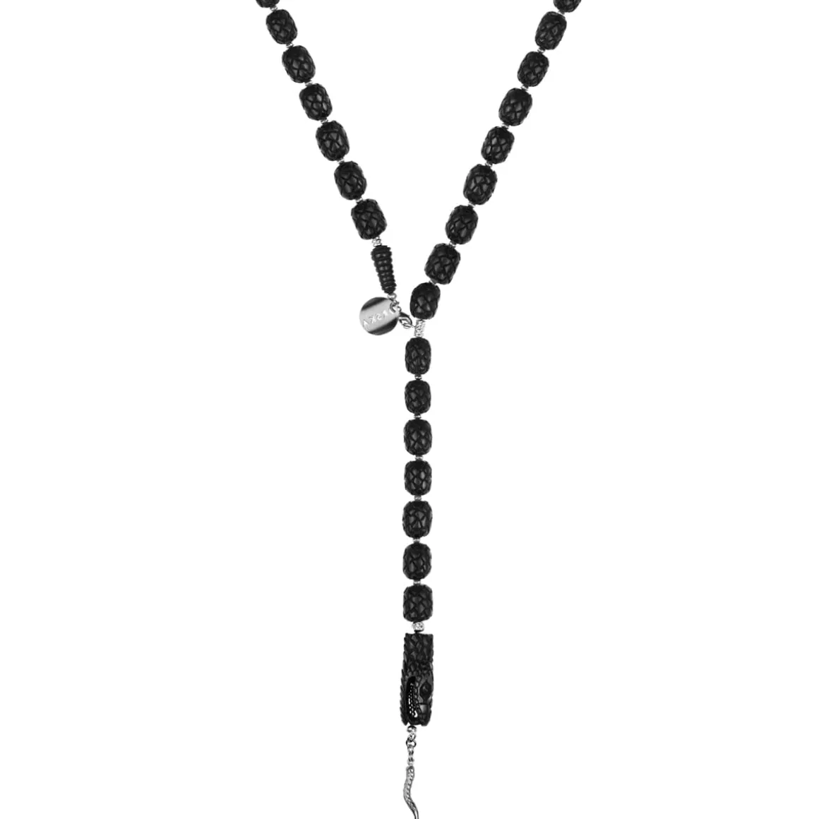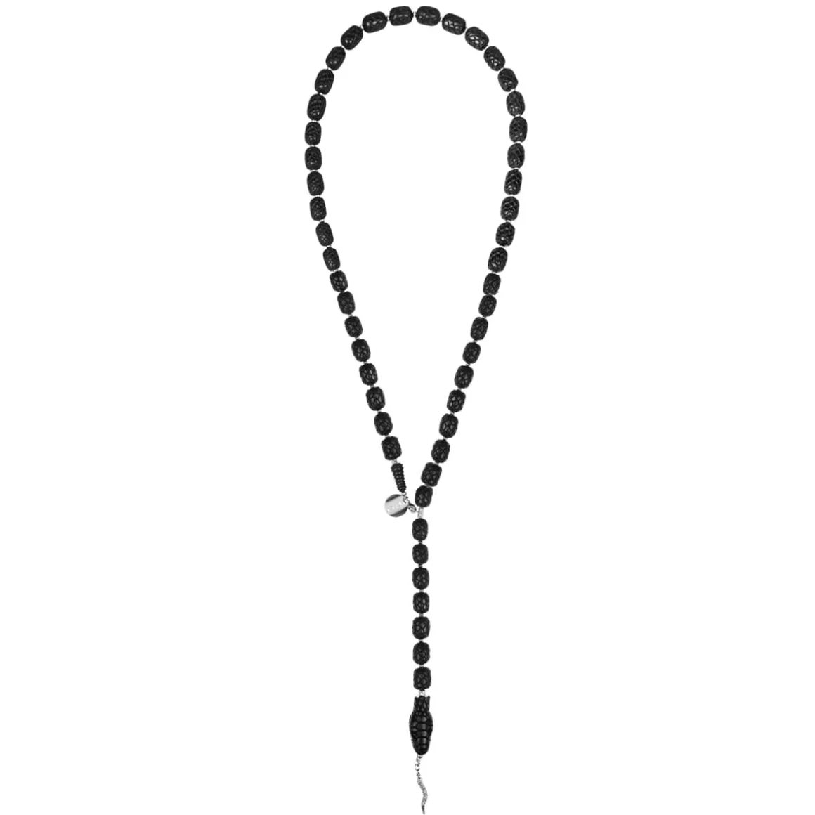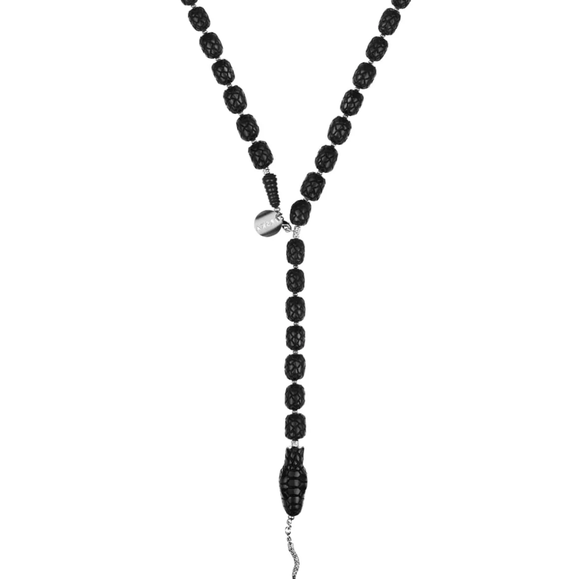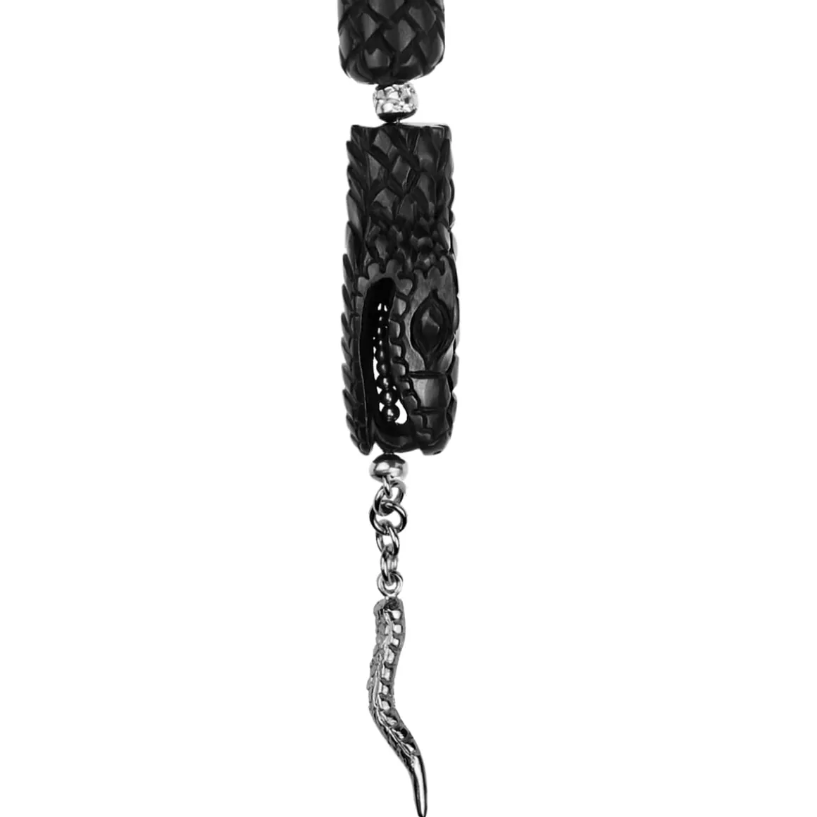 Długi naszyjnik w kształcie węża został wyrzeźbiony przez balijskich mistrzów w ciemnym, różanym drewnie. Każdy detal jest efektem ręcznej pracy, trwającej od kilku do kilkunastu godzin. Rzeźbione drewniane „korale” trafiły do pracowni ORSKA, gdzie połączyliśmy je z fasetowanymi kamieniami i srebrnymi elementami. Oksydowane srebro nadaje całości głębi i charakteru, podkreślając surowy styl naszyjnika. Zapięcie zdobi grawerowana blaszka z napisem „Limited Edition” oraz logo ORSKA. Na szczególną uwagę zasługuje głowa węża z wyraźnie zaznaczonymi szczegółami, takimi jak oczy i otwarta paszcza ze srebrnym językiem.