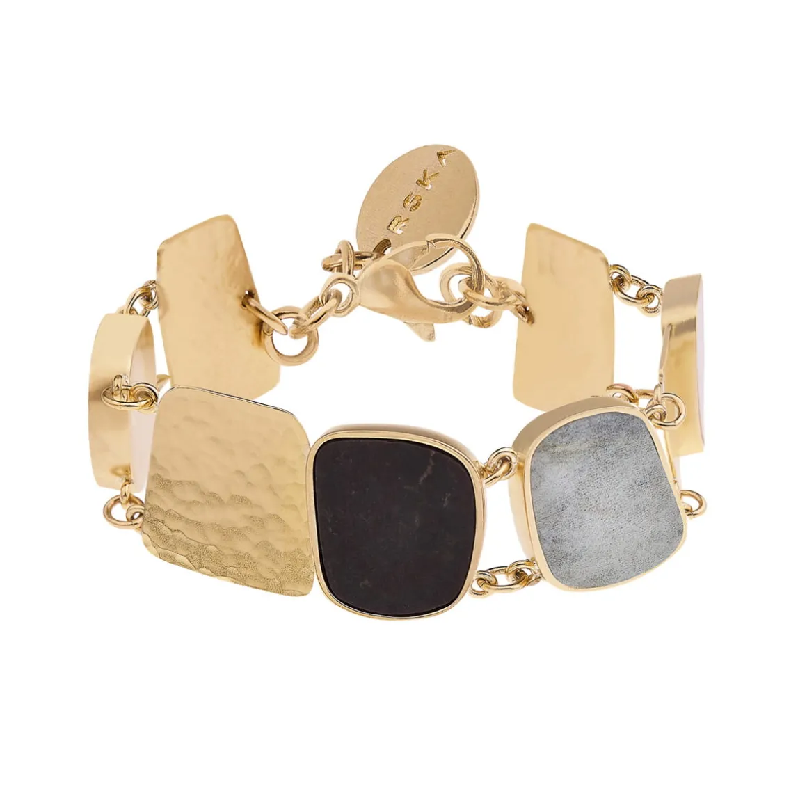 Artystyczna bransoletka z kolekcji Monumental została wykonana ręcznie w pracowni ORSKA. Powstała poprzez zestawienie ze sobą kilku wielobarwnych ceramicznych elementów oraz mosiężnych, pozłacanych form o kutej powierzchni. Fragmenty wykorzystanej ceramiki inspirowane są wzorami narysowanymi na skałach przez naturę, ich indywidualnym układem użyłkowania, kompozycjami barw i inkluzji. Dzięki temu każda bransoletka delikatnie różni się od przedstawionej na zdjęciach. Geometryczne formy podkreślają naturalne piękno flizy, a złote ogniwa nadają całości charakteru. Bransoletka zapinana jest na karabińczyk i zakończona logo ORSKA. Pozłacana bransoletka doskonale prezentuje się solo, ale lubi też towarzystwo pozostałych wzorów z kolekcji Monumental. Długi naszyjnik typu krawat lub ceramiczny pin utworzą wraz z nią duet, obok którego nie da się przejść obojętnie. Na naszej stronie internetowej w zakładce rozmiary znajdują się wskazówki jak odpowiednio dobrać rozmiar bransoletki.
