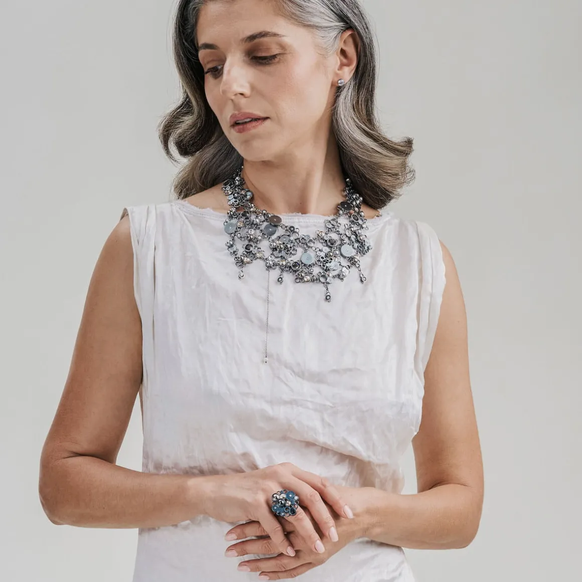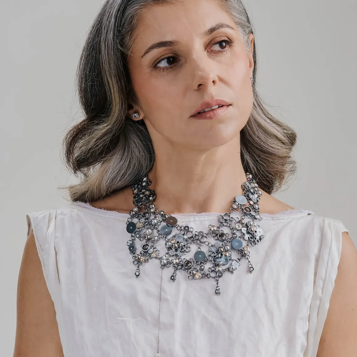 Kolekcja Soda to dyskretny flirt klasyki z nowoczesnością. Artystyczna kolia została wykonana ręcznie ze srebra. Imponujący naszyjnik subtelnie otula szyję łańcuchem srebrnych bąbelków wykonanych w technologii druku 3D, które skrywają bogate wnętrze. Delikatny urok ciemnych pereł, rozświetlony kryształami, współgra z grafitową szarością metalu. Efektowna biżuteria będzie idealną ozdobą dla wielbicieli nieoczywistych rozwiązań, spragnionych unikalnych doznań estetycznych.