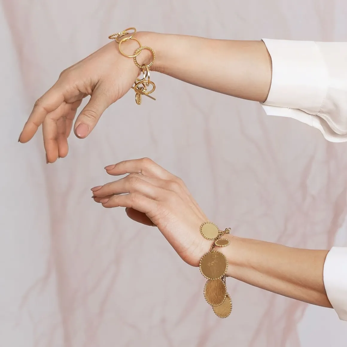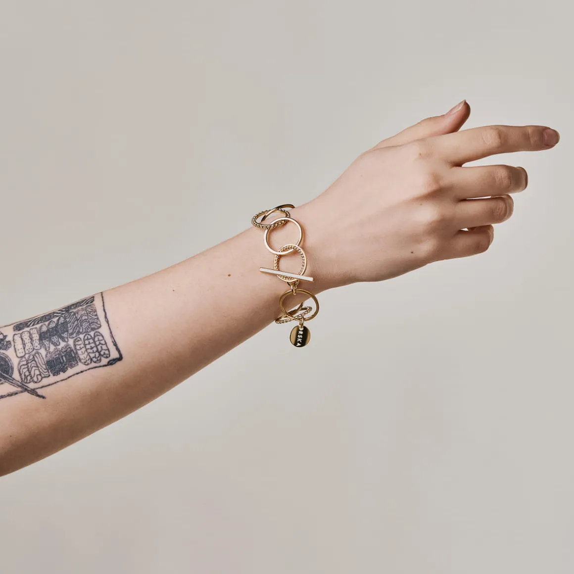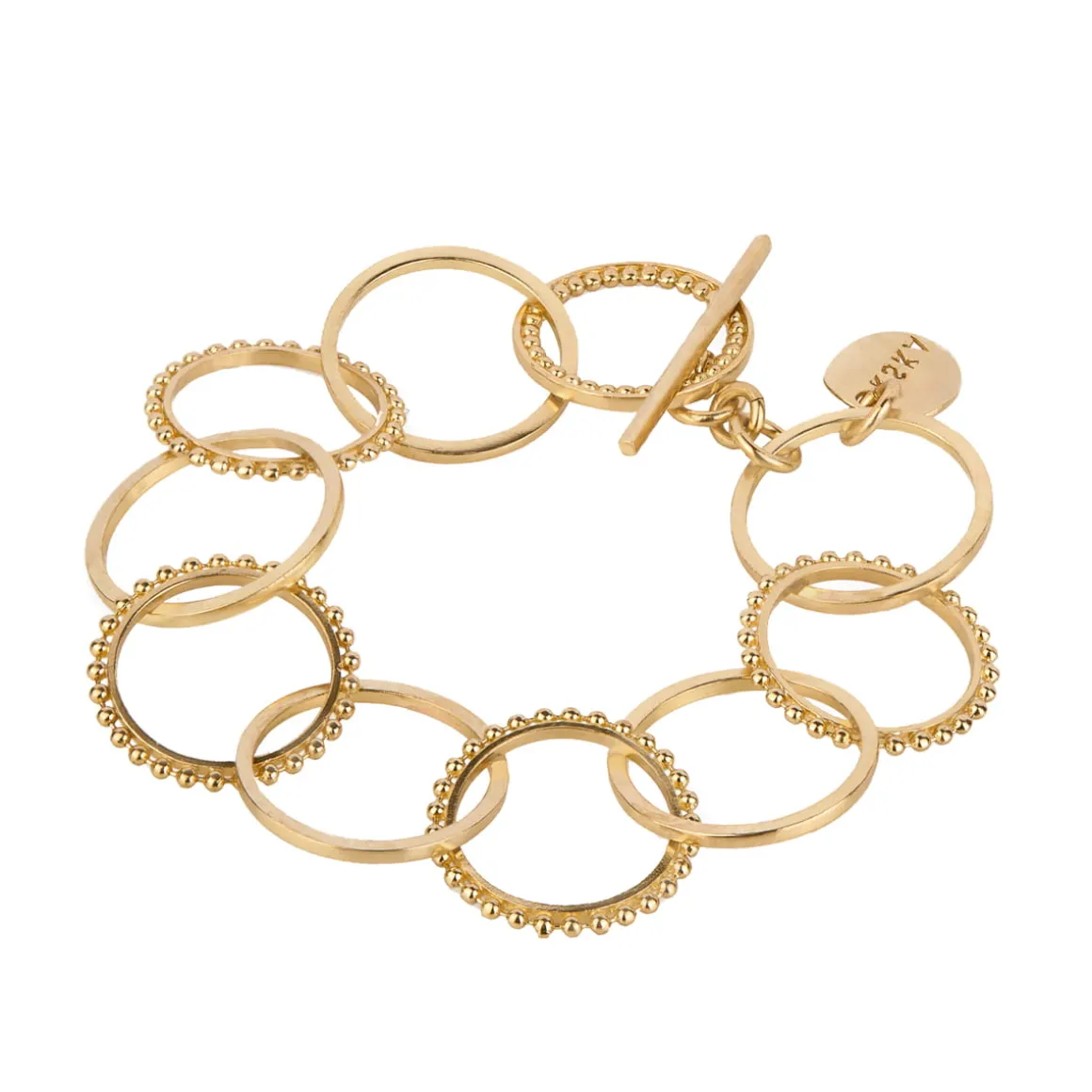 Klasyczna bransoletka została wykonana ręcznie z pozłacanego mosiądzu. Prostą formę ubogaca wykorzystanie różnorodnych ogniw tej samej wielkości oraz ich nieregularne rozmieszczenie. Zapinana na ozdobny skobelek rytmicznie dźwięczy przy każdym ruchu. Dzięki uniwersalnemu charakterowi i eleganckiej formie będzie świetnym uzupełnieniem wielu kreacji zarówno codziennych jak i wieczorowych. Minimalistyczny design sprawdzi się także w towarzystwie kolczyków i naszyjników z kolekcji RAY.