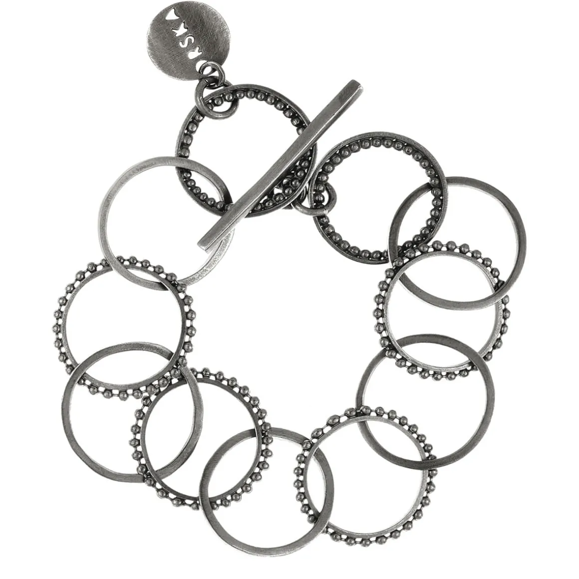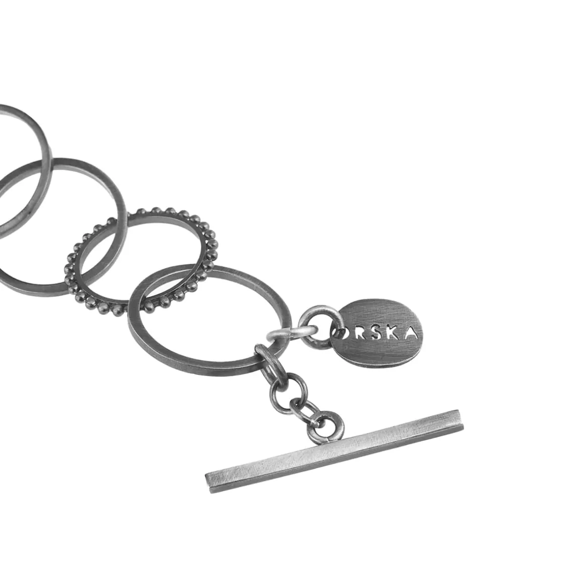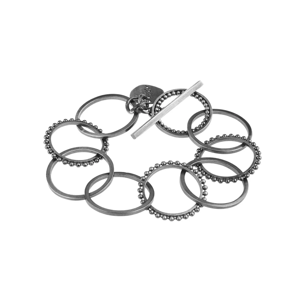 Klasyczna bransoletka została wykonana ręcznie ze srebra. Prostą formę ubogaca wykorzystanie różnorodnych ogniw tej samej wielkości oraz ich nieregularne rozmieszczenie. Zapinana na ozdobny skobelek rytmicznie dźwięczy przy każdym ruchu. Dzięki uniwersalnemu charakterowi i eleganckiej formie będzie świetnym uzupełnieniem wielu kreacji zarówno codziennych jak i wieczorowych. Minimalistyczny design sprawdzi się także w towarzystwie kolczyków i naszyjników z kolekcji RAY.