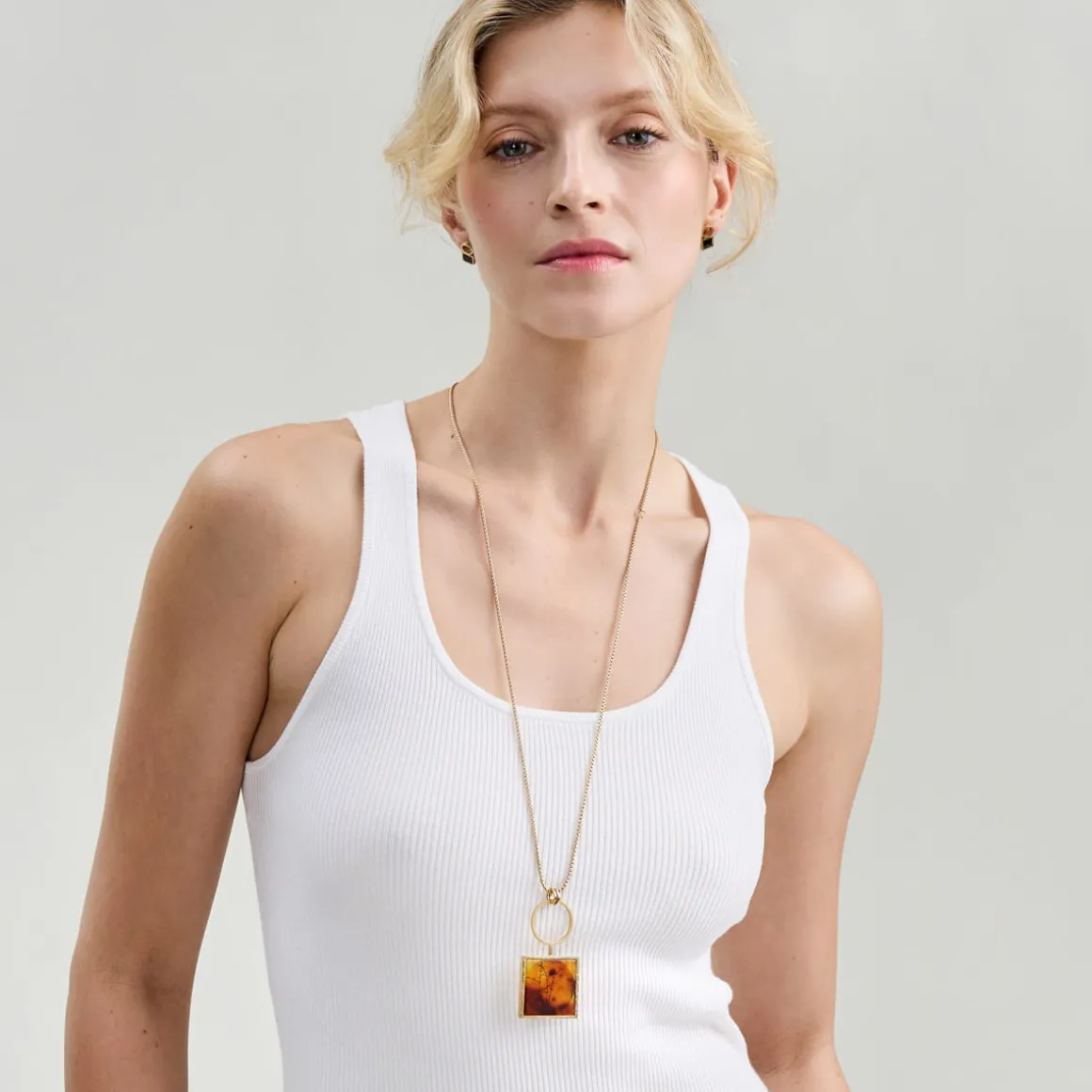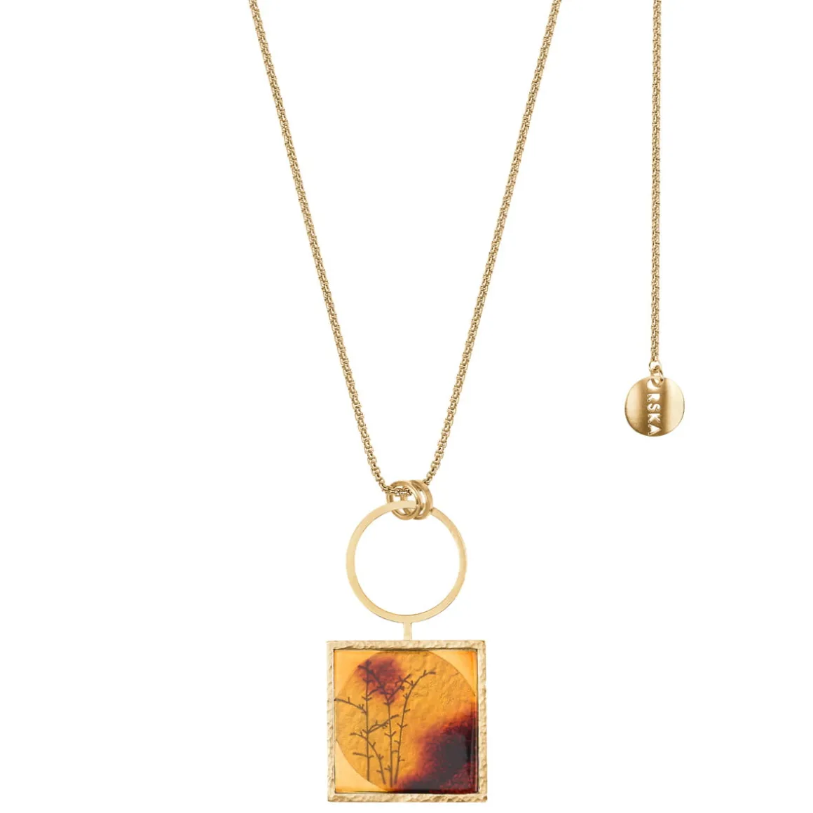 Naszyjnik wykonaliśmy ręcznie z pozłacanego mosiądzu i naturalnego bursztynu. Długi łańcuszek o splocie kostki ozdobiliśmy efektowną zawieszką. Do pozłacanego okręgu podwiesiliśmy kwadratową oprawę w którą wpasowaliśmy częściowo transparentny, polski bursztyn. Złoty kamień pozwala spojrzeć na okrągłą pozłacaną blaszkę o kutej powierzchni oraz roślinny grawer, przypominający roślinną inkluzję. Łańcuszek posiada trzy możliwe zapięcia, pozwalające na regulację długości. Zapięcie na karabińczyk oraz dwa ogniwa przy zawieszce czynią naszyjnik funkcjonalnym i wygodnym w użytkowaniu. Kuta oprawa kamienia i geometryczne formy dodają całości elegancji. Tworząc naszyjnik z kolekcji Baltica, użyliśmy naturalnych bursztynów, dzięki czemu każdy egzemplarz jest wyjątkowy. Nie ma dwóch identycznych naszyjników, tak jak nie ma dwóch identycznych kawałków bursztynu. Naszyjnik doskonale prezentuje się solo, jeśli jednak chcesz stworzyć stylizacje na specjalną okazję, połącz go z pozłacanym pierścionkiem z transparentnym kryształem z kolekcji Julia lub szeroką ażurową bransoletą z kolekcji Apis – taki zestaw zwróci na ciebie wszystkie spojrzenia.