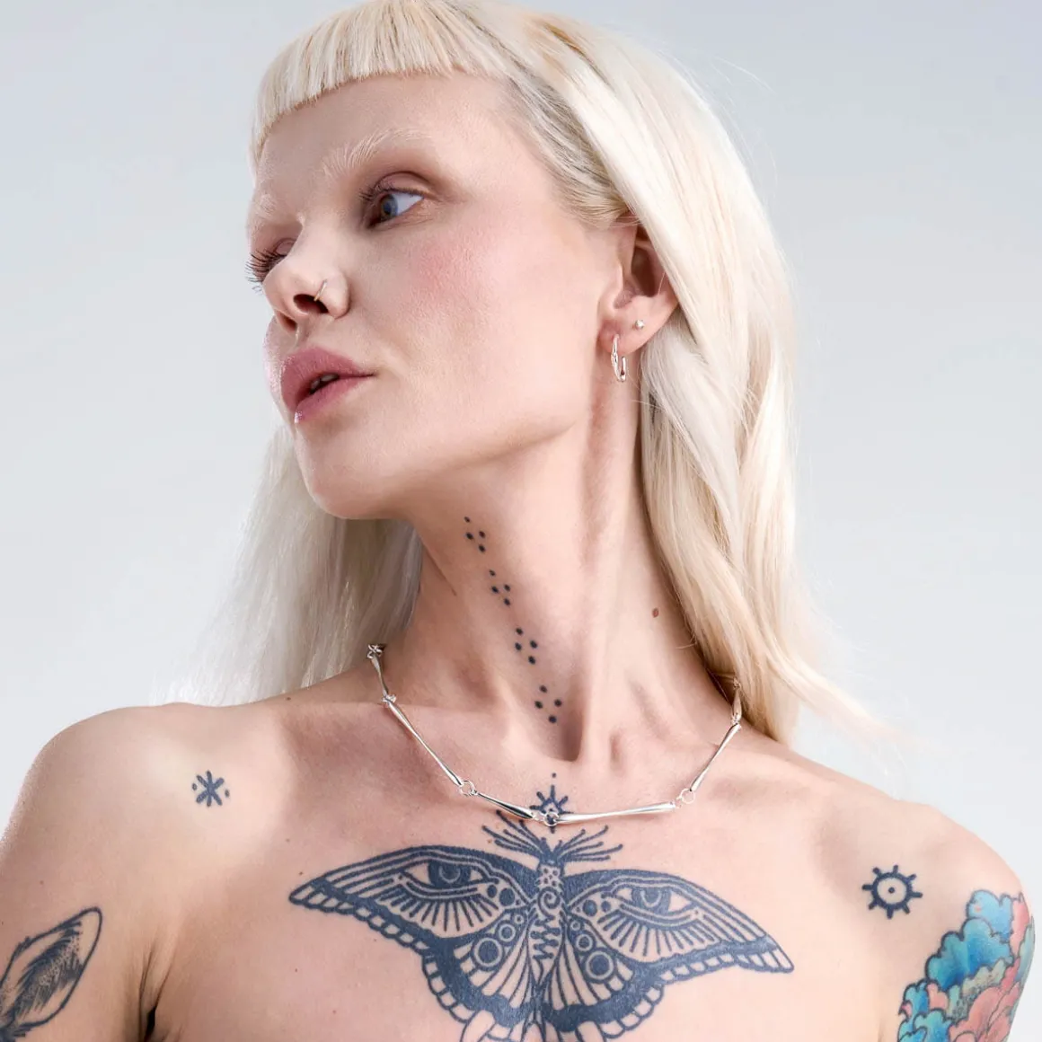 Delikatny naszyjnik został wykonany z połączonych ze sobą, podłużnych kropel. Poszczególne elementy są różnej długości, co podkreśla oryginalny charakter ręcznie wykonanej biżuterii. Dzięki przedłużce, zakończonej metalową kroplą, srebrny naszyjnik ma możliwość regulacji długości. Tuż przy zapięciu naszyjnik został opatrzony okrągłą nieregularna pieczęcią “made by Homo Sapiens”. Nawiązując do przesłania kolekcji przypomina ona o odpowiedzialności za dzieła, które tworzymy i ich wpływ na przyrodę. Opływowy, nieregularny kształt elementów tworzących naszyjnik, kojarzy się z wodą, która zbyt często staje się docelową destynacją dla jednorazowego plastiku.