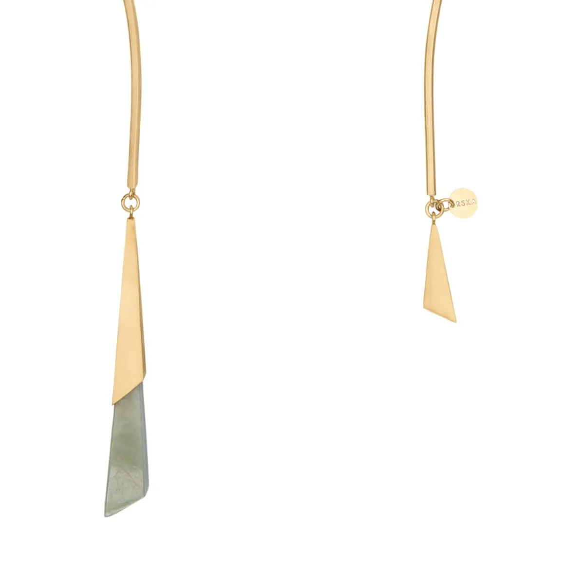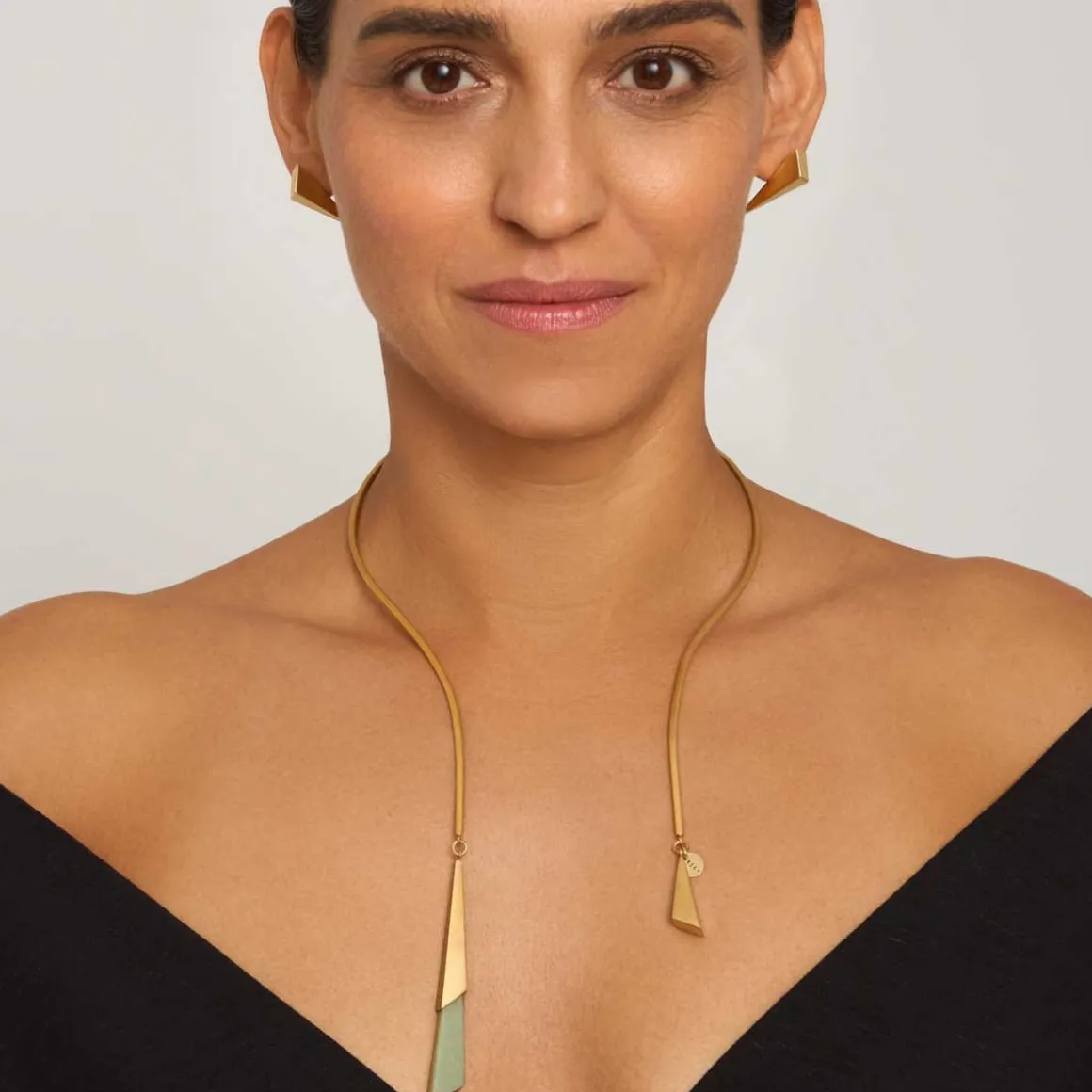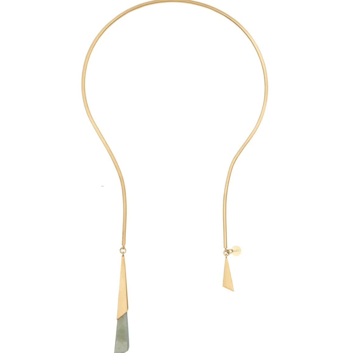 Kolia została wykonana ręcznie z pozłacanego mosiądzu w formie sztywnej, asymetrycznej konstrukcji, która zmysłowo oplata szyję i zdobi dekolt. Z jednej strony kolia zakończona jest mosiężną, złoconą zawieszką w kształcie ostrosłupa, z drugiej – dużą, geometryczną zawieszką z jasnozielonym jadeitеm. Metal został uformowany tak, by subtelnie podążać za linią szyi, tworząc elegancką, rzeźbiarską kompozycję, która przyciąga wzrok i nadaje stylizacji charakteru. To biżuteria stworzona na specjalne okazje – wieczorne wyjścia, eleganckie kolacje, wydarzenia, w których chcesz wyglądać wyjątkowo.