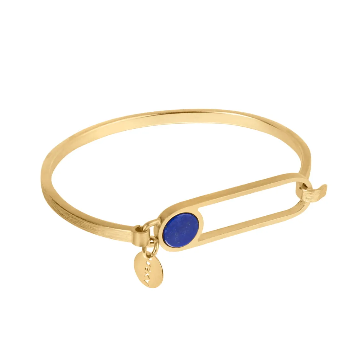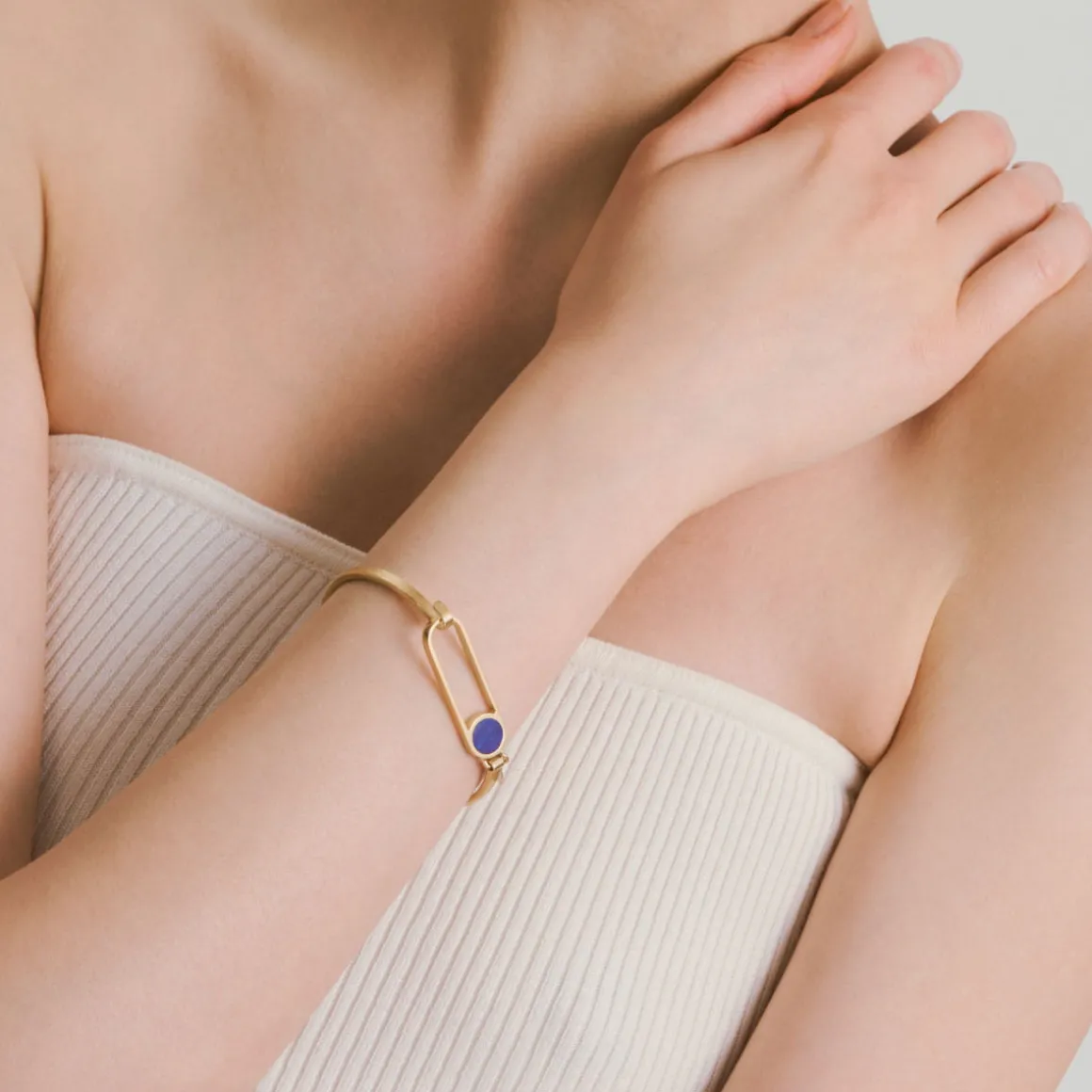 Bransoletka z kolekcji Orini została wykonana w naszym warsztacie z pozłacanego mosiądzu. Smukła, sztywna obręcz delikatnie oplata nadgarstek. Centralnym punktem biżuterii jest owalny element ozdobiony okrągłym kamieniem lapis lazuli, którego głęboki niebieski odcień kontrastuje ze złotym kolorem oprawy. Bransoletka ma ręcznie szczotkowaną obręcz, natomiast geometryczna forma ma gładkie, satynowe wykończenie. Ta gra struktur symbolizuje dualizm światła i cienia, przypominając, że jedno i drugie są nieodłącznym elementem cykliczności życia.