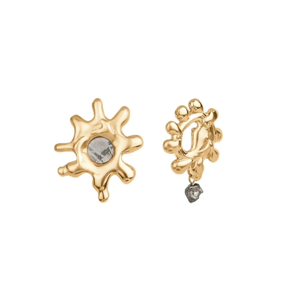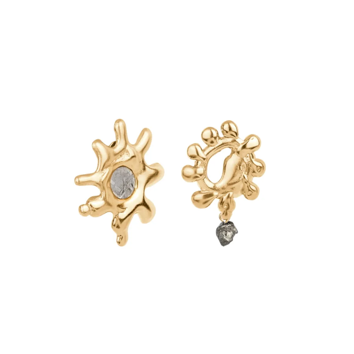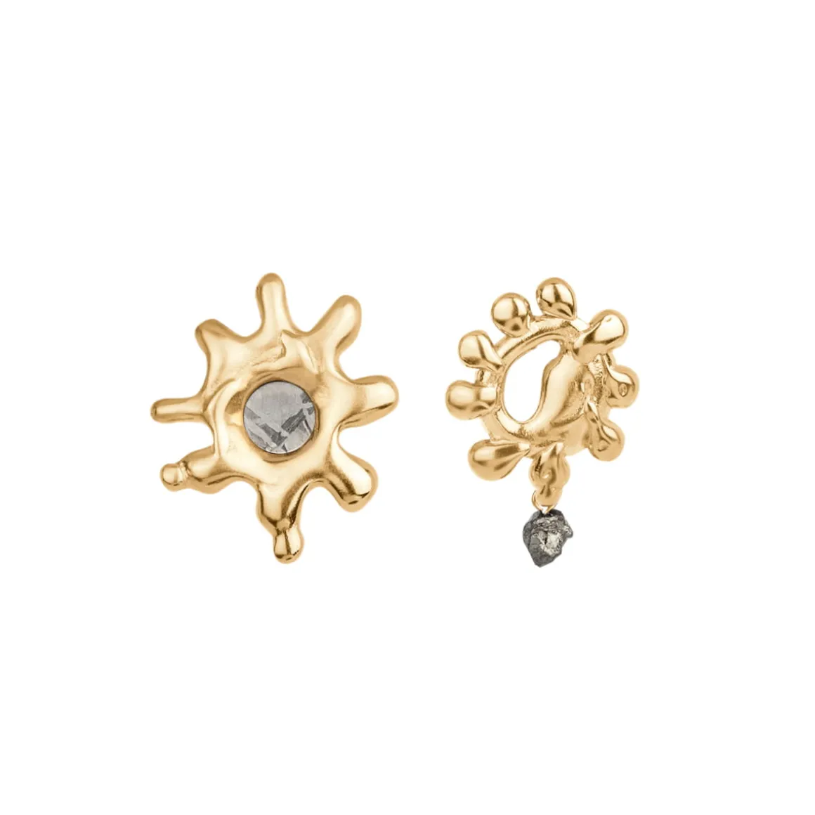 Kolczyki na sztyft z kolekcji Meteoros to połączenie najstarszego na naszej Planecie surowca i artystycznego kunsztu jubilerów ORSKA, które razem tworzą kompozycję inspirowaną niezmierzoną przestrzenią kosmosu. Kolczyki zostały wykonane ręcznie z pozłacanego mosiądzu. Mają miękną, niemal płynną formę, która od razu przyciąga wzrok. Jeden z kolczyków ma kształt nieregularnej, rozgałęzionej formy, przypominającej eksplozję gwiezdnej materii, w którego centrum osadzono fragment meteorytu Aletai. Kamień jest okrągły, o naturalnej srebrzystej powierzchni i jodełkowej strukturze. Ujawniająca się po szlifowaniu meteorytu kompozycja zwana jest wzorem Widmanstaetena. Szaro-stalowa barwa meteorytu przenika się z błyszczącym srebrem otaczającej go oprawy. Drugi, asymetryczny kolczyk posiada nieregularną formę z wydłużonymi, zaokrąglonymi wypustkami i dodatkowo ozdobiony jest wiszącym, fasetowanym pirytem.