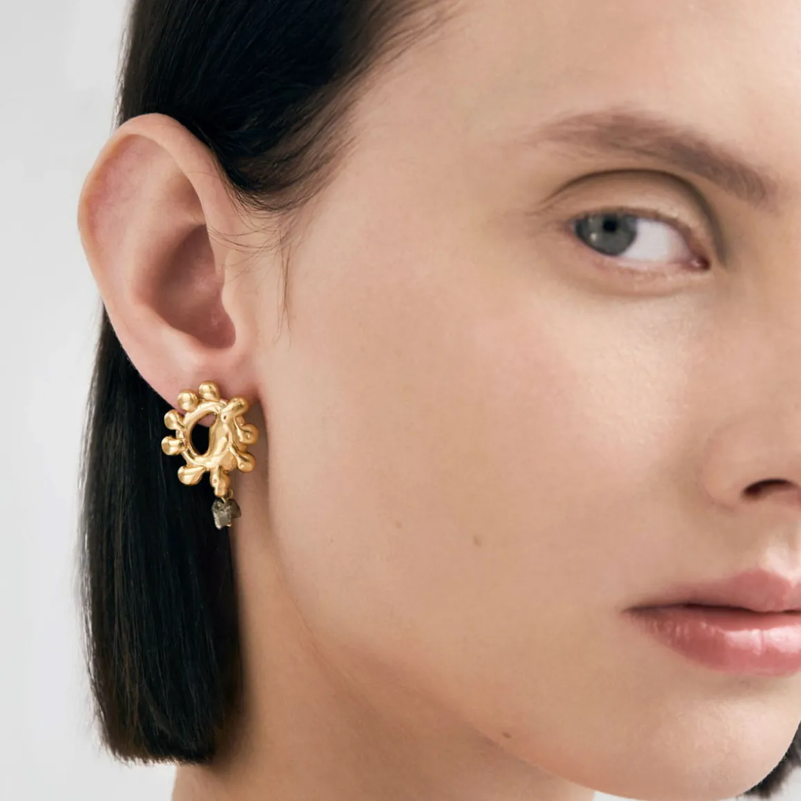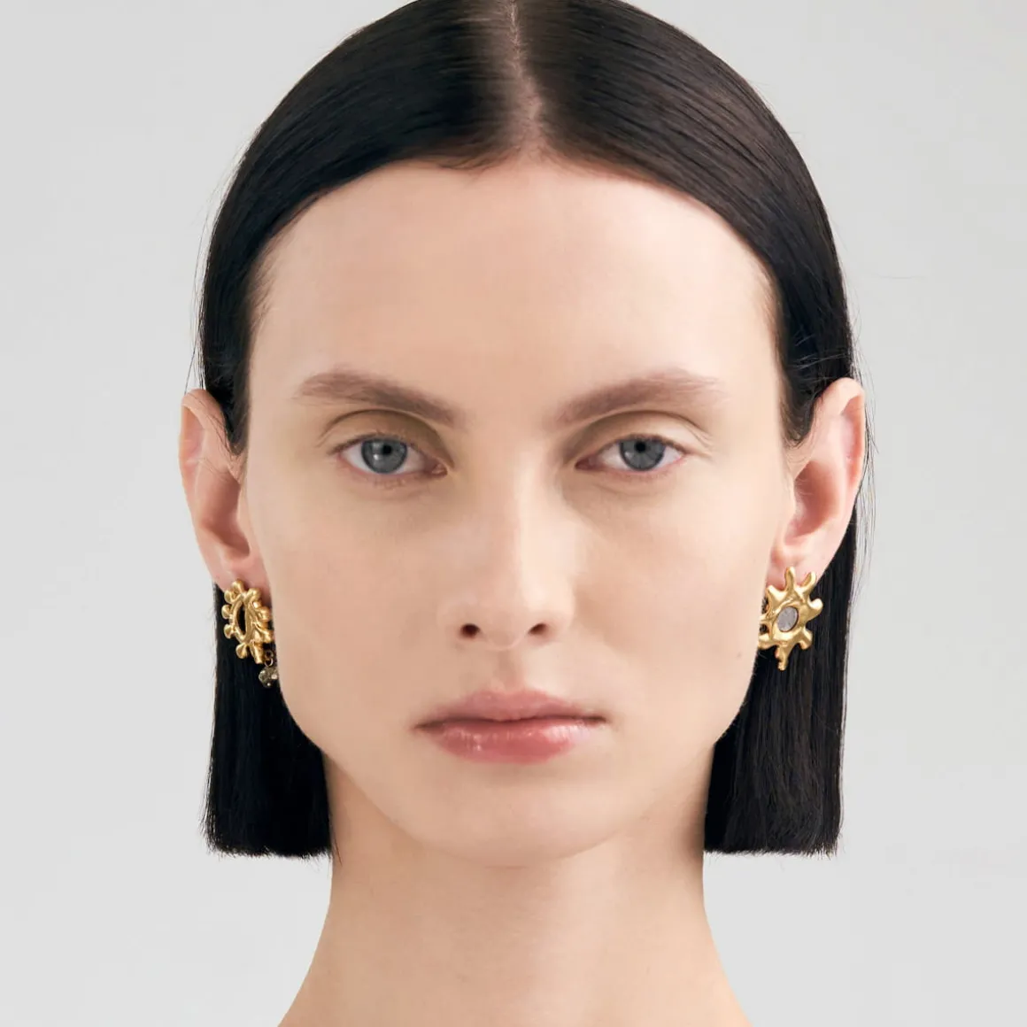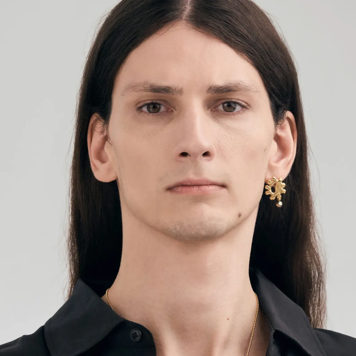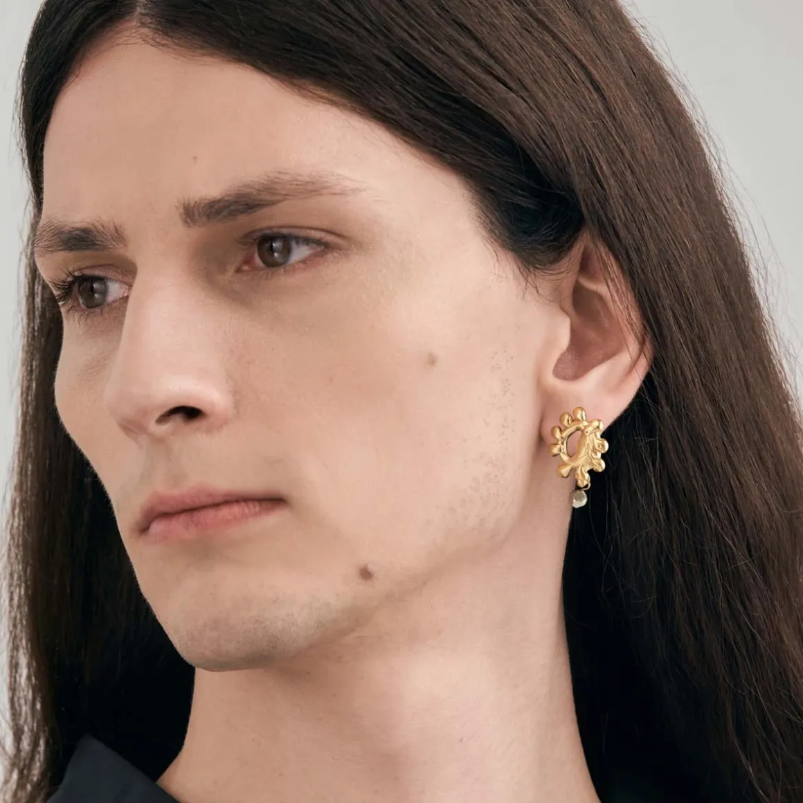 Kolczyki na sztyft z kolekcji Meteoros to połączenie najstarszego na naszej Planecie surowca i artystycznego kunsztu jubilerów ORSKA, które razem tworzą kompozycję inspirowaną niezmierzoną przestrzenią kosmosu. Kolczyki zostały wykonane ręcznie z pozłacanego mosiądzu. Mają miękną, niemal płynną formę, która od razu przyciąga wzrok. Jeden z kolczyków ma kształt nieregularnej, rozgałęzionej formy, przypominającej eksplozję gwiezdnej materii, w którego centrum osadzono fragment meteorytu Aletai. Kamień jest okrągły, o naturalnej srebrzystej powierzchni i jodełkowej strukturze. Ujawniająca się po szlifowaniu meteorytu kompozycja zwana jest wzorem Widmanstaetena. Szaro-stalowa barwa meteorytu przenika się z błyszczącym srebrem otaczającej go oprawy. Drugi, asymetryczny kolczyk posiada nieregularną formę z wydłużonymi, zaokrąglonymi wypustkami i dodatkowo ozdobiony jest wiszącym, fasetowanym pirytem.