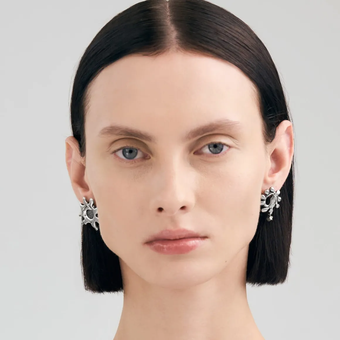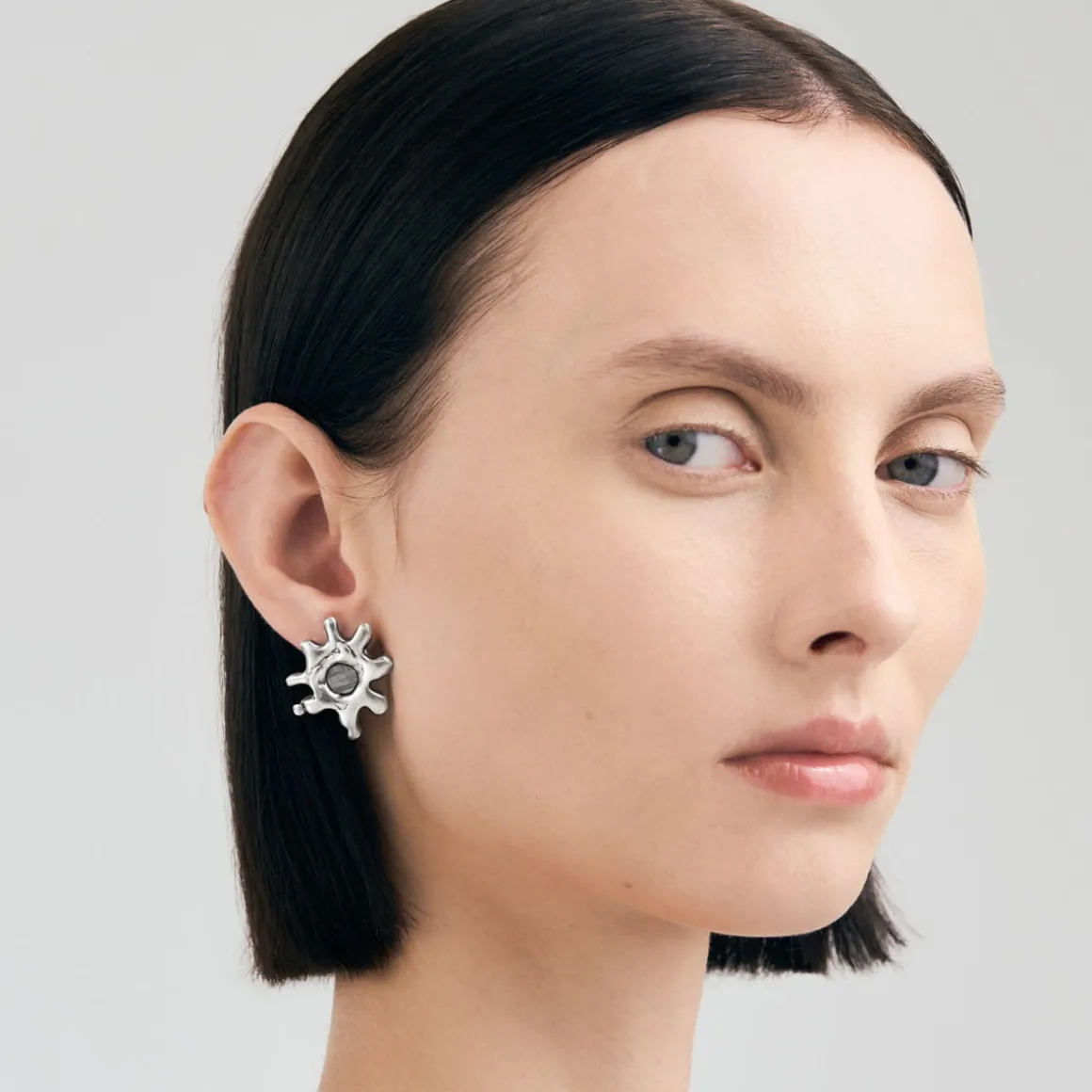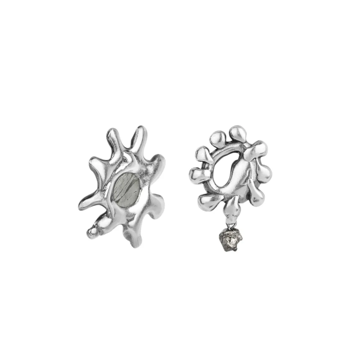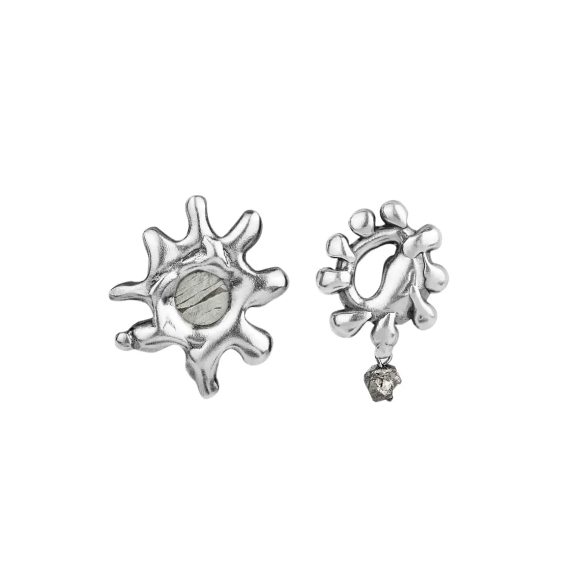 Kolczyki na sztyft z kolekcji Meteoros to połączenie najstarszego na naszej Planecie surowca i artystycznego kunsztu jubilerów ORSKA, które razem tworzą kompozycję inspirowaną niezmierzoną przestrzenią kosmosu. Kolczyki zostały wykonane ręcznie ze srebra próby 925. Dzięki metodzie lanego metalu kolczyki zyskały miękną, niemal płynną formę, która od razu przyciąga wzrok. Jeden z kolczyków ma kształt nieregularnej, rozgałęzionej formy, przypominającej eksplozję gwiezdnej materii, w którego centrum osadzono fragment meteorytu Aletai. Kamień jest okrągły, o naturalnej srebrzystej powierzchni i jodełkowej strukturze. Ujawniająca się po szlifowaniu meteorytu kompozycja zwana jest wzorem Widmanstaetena. Szaro-stalowa barwa meteorytu przenika się z błyszczącym srebrem otaczającej go oprawy. Drugi, asymetryczny kolczyk posiada nieregularną formę z wydłużonymi, zaokrąglonymi wypustkami i dodatkowo ozdobiony jest wiszącym, fasetowanym pirytem.