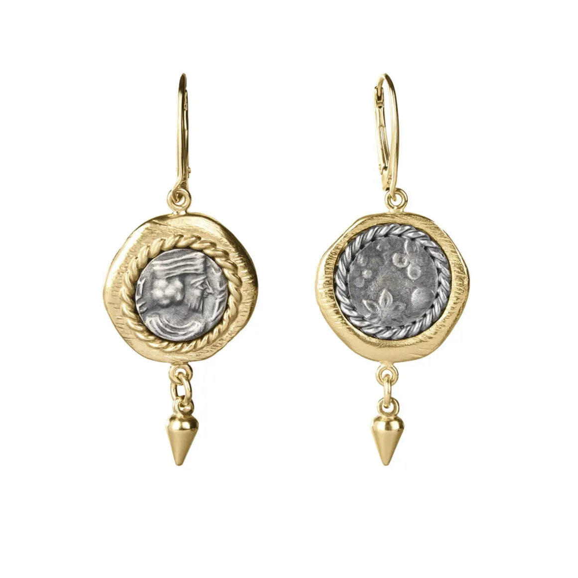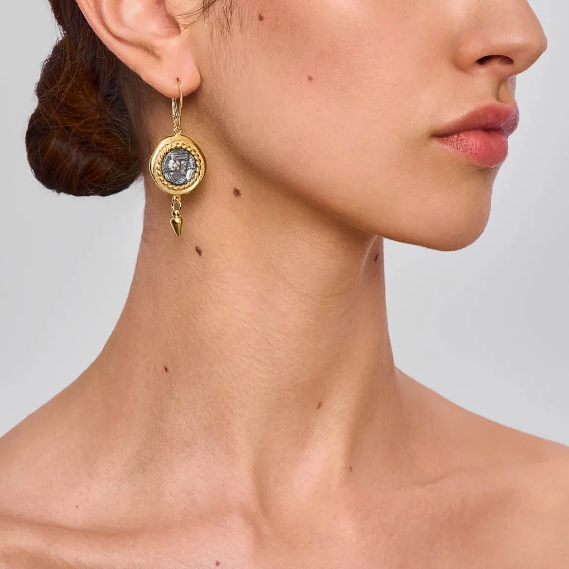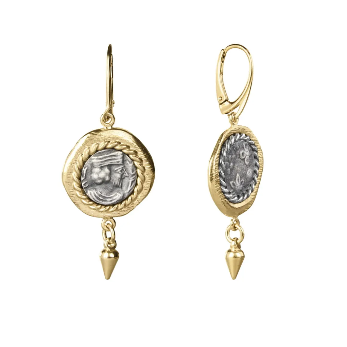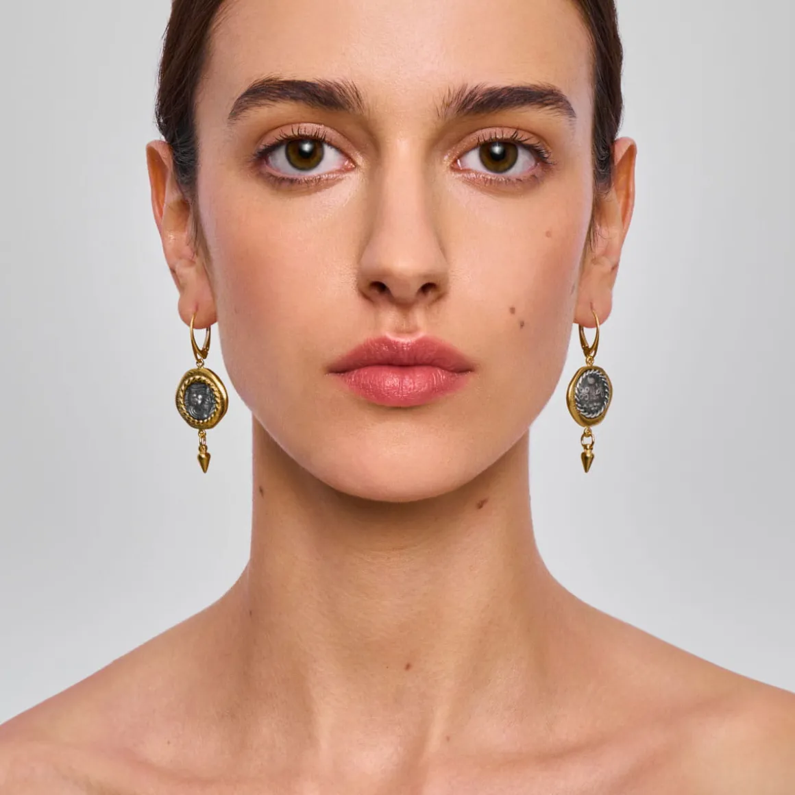 Asymetryczne kolczyki zostały wykonane ręcznie w naszej pracowni jubilerskiej. Przyciągają uwagę fragmentami medalionów, które powstały z oksydowanego srebra próby 925. Na jednym z nich wytłoczony jest wizerunek królewskiej postaci, na drugim, delikatny ornament inspirowany kwiatowym motywem. Oba symbole zatopione zostały w oprawie przypominającej nieregularną pieczęć, na której brzegach dostrzec można odciski palców jubilerów z pracowni ORSKA. Linie papilarne widoczne są również na tylnej stronie kolczyków. Są one znakiem obecności, uważności i indywidualnego zaangażowania. To subtelny podpis przypominający, że za każdym egzemplarzem stoi człowiek. Symboliczne pieczęci zostały opatrzone wiszącymi ćwiekami z pozłacanego mosiądzu, które śmiało połyskują przy każdym ruchu głową.