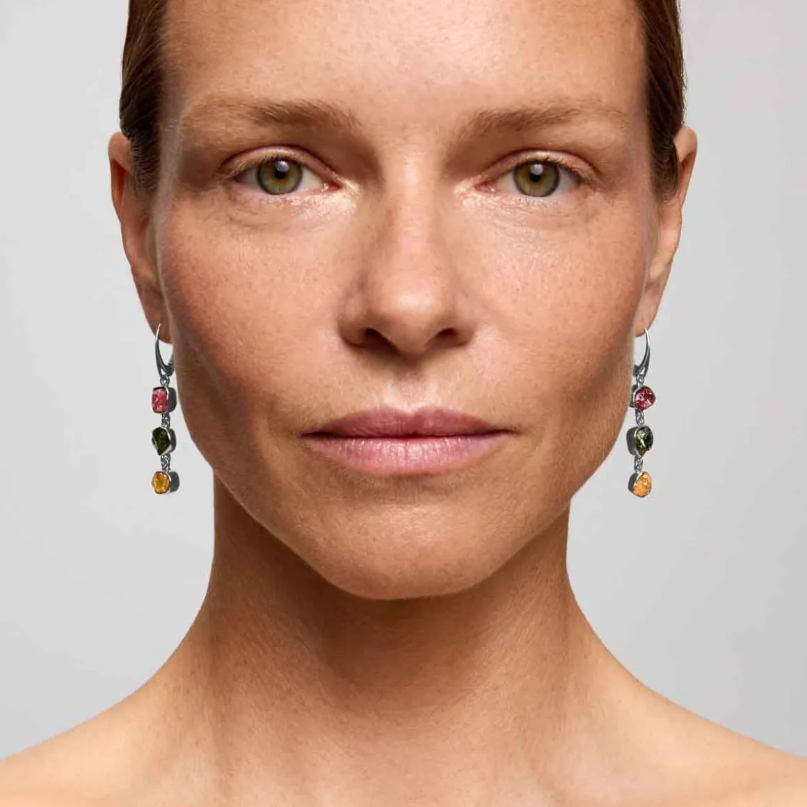 Angielskie bigle wykonane ze srebra próby 925 ozdobione zostały różnokolorowymi turmalinami. Na samym szczycie tuż przy zapięciach umieszczono rubellity, turmaliny w fioletowo-różowym odcieniu. Tuż pod nimi uwagę przyciągają ciemne turmaliny w odcieniu butelkowej zieleni – verdelity. Cała kompozycję wieńczą bryłki drafi, odmiany kamienia o bursztynowej barwie. Turmaliny użyte w kolekcji Aurora pochodzą z Radżastanu, gdzie zostały obrobione w kameralnym, rodzinnym warsztacie jubilerskim. Anna Orska poznała jego właścicieli podczas projektowej podróży do Indii. Kamienie nie były szlifowane, lecz łupane – dzięki temu zachowały pierwotny charakter i nieregularne, surowe formy. Każdy z nich został indywidualnie oprawiony w srebro. To podejście nadaje kolekcji wyjątkowości, ponieważ w jubilerstwie zwykle stosuje się ustandaryzowane, powtarzalne oprawy.