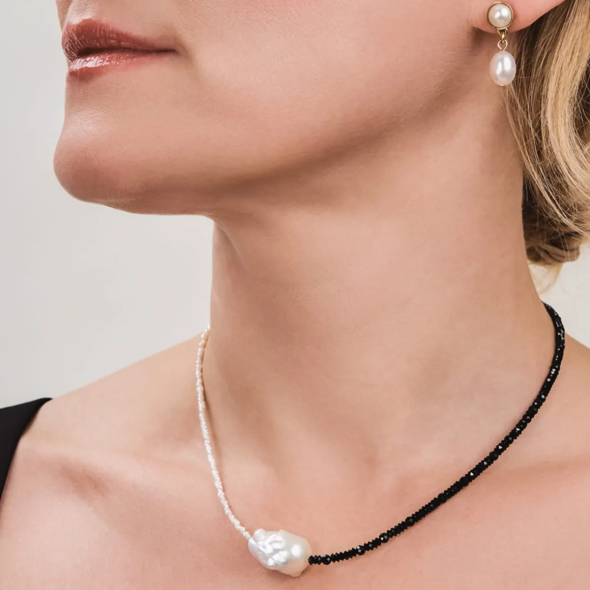 Krótki naszyjnik powstał z wykorzystaniem perły i onyksów, których głęboka czerń subtelnie kontrastuje z satynową powierzchnią słodkowodnych klejnotów. Elegancki naszyjnik ozdobiony został okazałą, nieregularną perłą z zatoki Ha long i wykończony mosiężnym łańcuszkiem, który umożliwia niewielką regulację długości. Charakterystyczne wzornictwo i wyrazista kolorystyka ukazują współczesną interpretację sztuki według artystki. Artystyczna biżuteria w połączeniu z kolczykami stworzy niebanalny komplet.