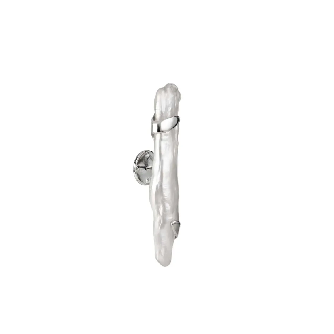 Sercem tego pinu jest perła – okazała, efektowna, nieoczywista. Nie ma dwóch takich samych pereł, każdy pin jest inny. Anna Orska kolekcjonowała te okazy przez kilka lat, dbając o ich ciekawe, nieregularne kształty. Dzięki temu każdy egzemplarz jest małym dziełem sztuki, rzeźbą stworzoną przez naturę. Podłużna perła została uchwycona w delikatne srebrne ramy, które subtelnie otulają kamień, podkreślając jego kształt. Każdy egzemplarz oprawiany był indywidualnie, dlatego cienkie srebrne fragmenty mogą wyłaniać się z różnych stron pina w zależności od naturalnych wżłobień w perle. Jubilerzy z pracowni ORSKA z dużą zręcznością oprawili każdą perłę, podkreślając jej atuty i indywidualizm. Powierzchnia pereł pokryta jest charakterystycznymi wypukłościami i załamaniami, które sprawiają, że kamienie mienią się przy każdym ruchu.
