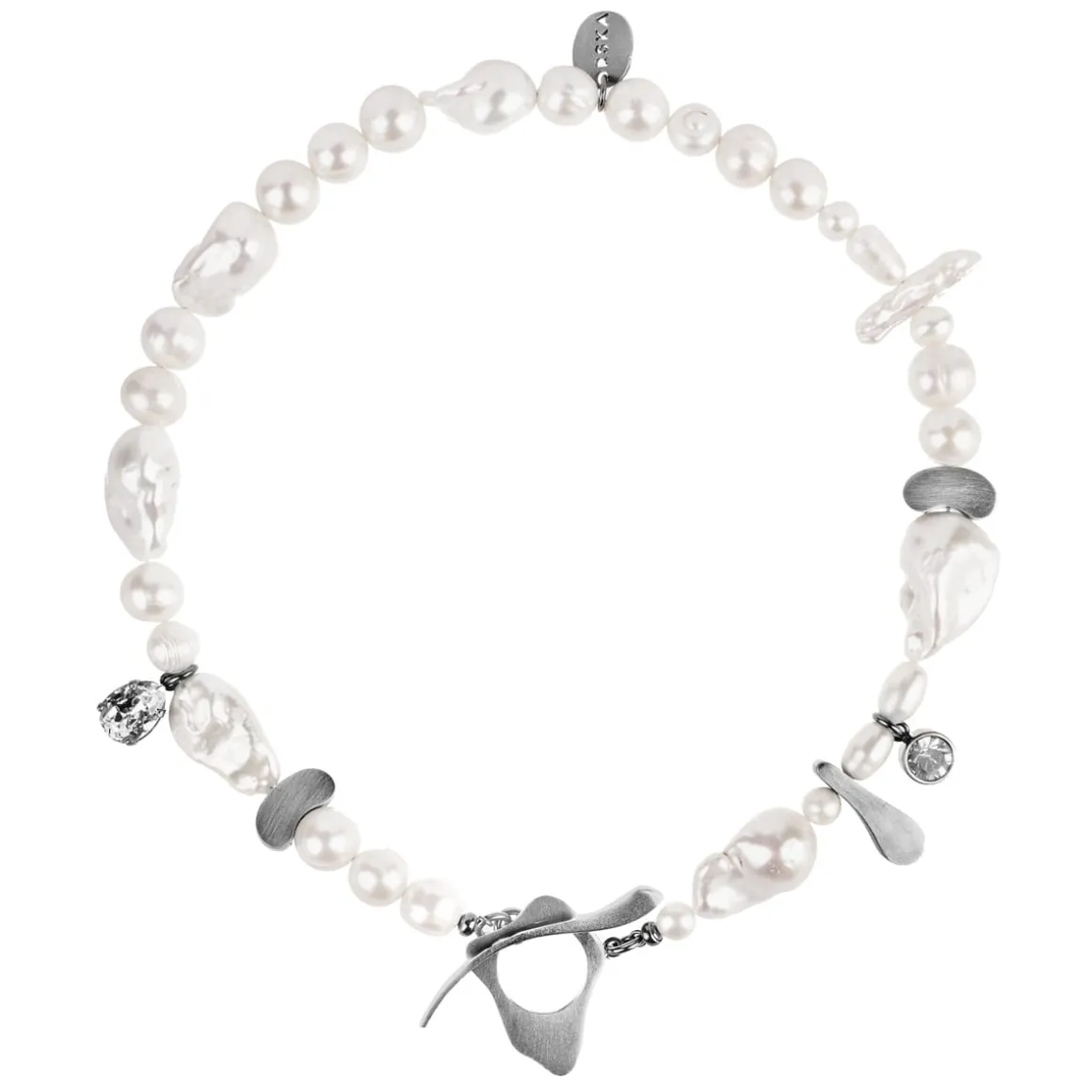 Artystyczny naszyjnik powstał poprzez połączenie okazałych, nieregularnych pereł słodkowodnych w różnych rozmiarach ze srebrnymi zawieszkami o finezyjnych kształtach. Naszyjnik zapinany jest na ozdobny skobelek, którego miękkie linie przywodzą na myśl malarskie zdobienia art nouveau. Efektowna biżuteria nie jest zwykłym dodatkiem, lecz sama w sobie tworzy kreację! Naszyjnik skutecznie przyciąga spojrzenia, ale jeszcze mocniej zachwyca w towarzystwie innych wzorów z kolekcji: asymetrycznych kolczyków, bransoletki z pereł czy czarno-białego pierścionka.