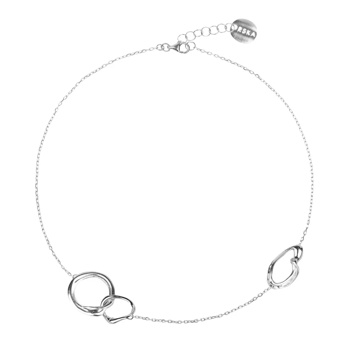 Krótki naszyjnik wykonano ręcznie ze srebra. Biżuteria łączy delikatny łańcuszek z asymetrycznymi zawieszkami w postaci okręgów. Trzy nieregularne ogniwa różnią się od siebie wielkością i kształtem. Pofalowana struktura sprawia, że wyglądają jakby były wykonane z lejącego się srebra. Wypolerowane na wysoki połysk jasne zawieszki nawiązują do tafli wody, w której jednorazowy plastik często kończy swój żywot. Ręcznie wykonany ze srebra naszyjnik, ma możliwość regulacji długości – krótką przedłużkę na końcu ozdobiono okrągłym logiem ORSKA.