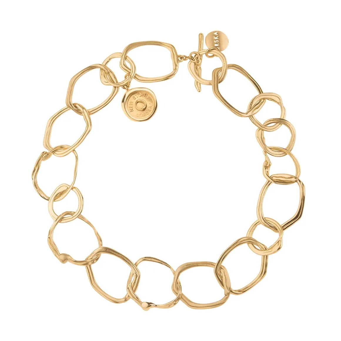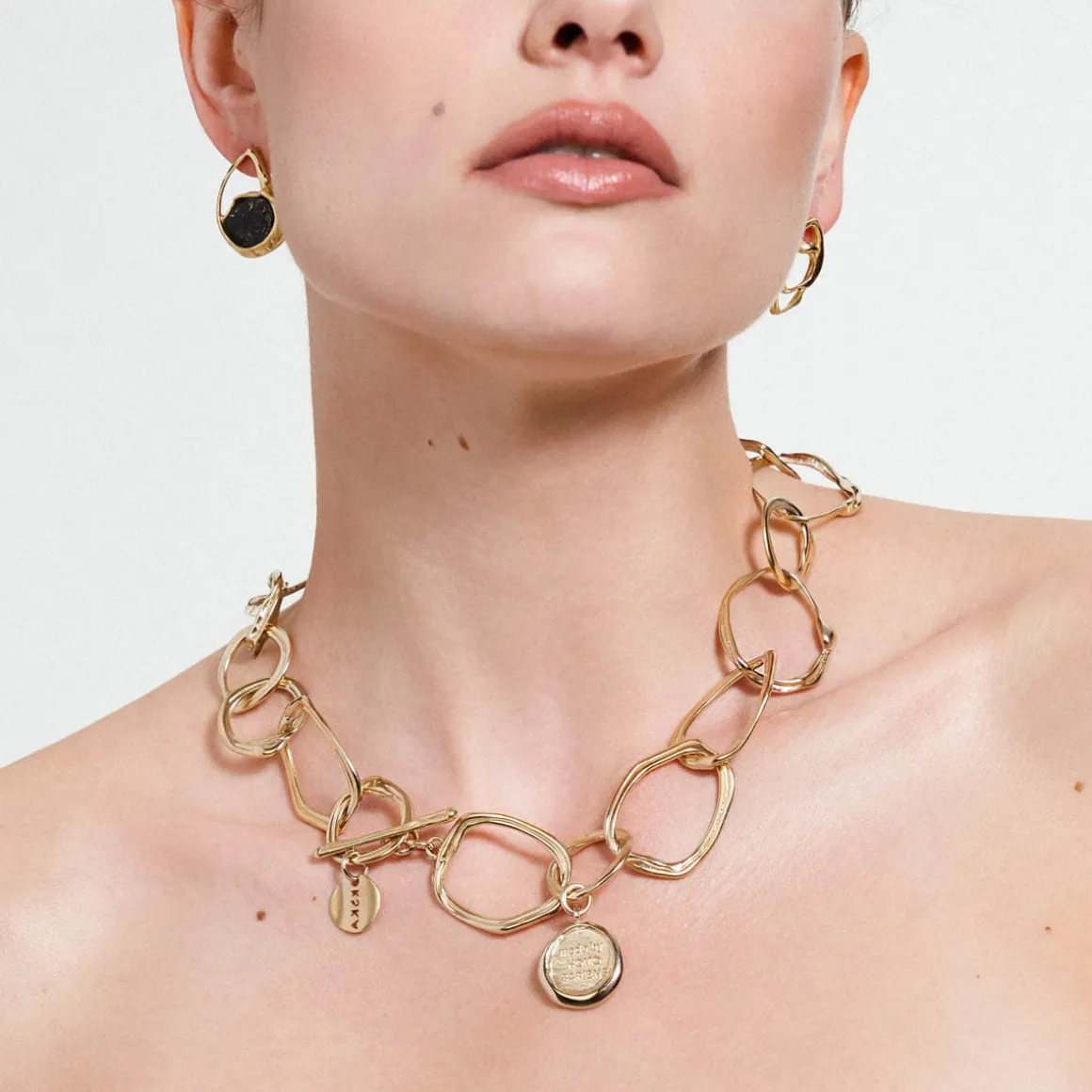 Krótki naszyjnik z kolekcji New Stone został wykonany ręcznie z pozłacanego mosiądzu. Połączone ze sobą ogniwa o nieregularnej linii i falistej strukturze tworzą efektowną kolię. Całość opatrzona została pieczęcią „made by Homo Sapiens”, która nawiązuje do myśli przewodniej kolekcji.