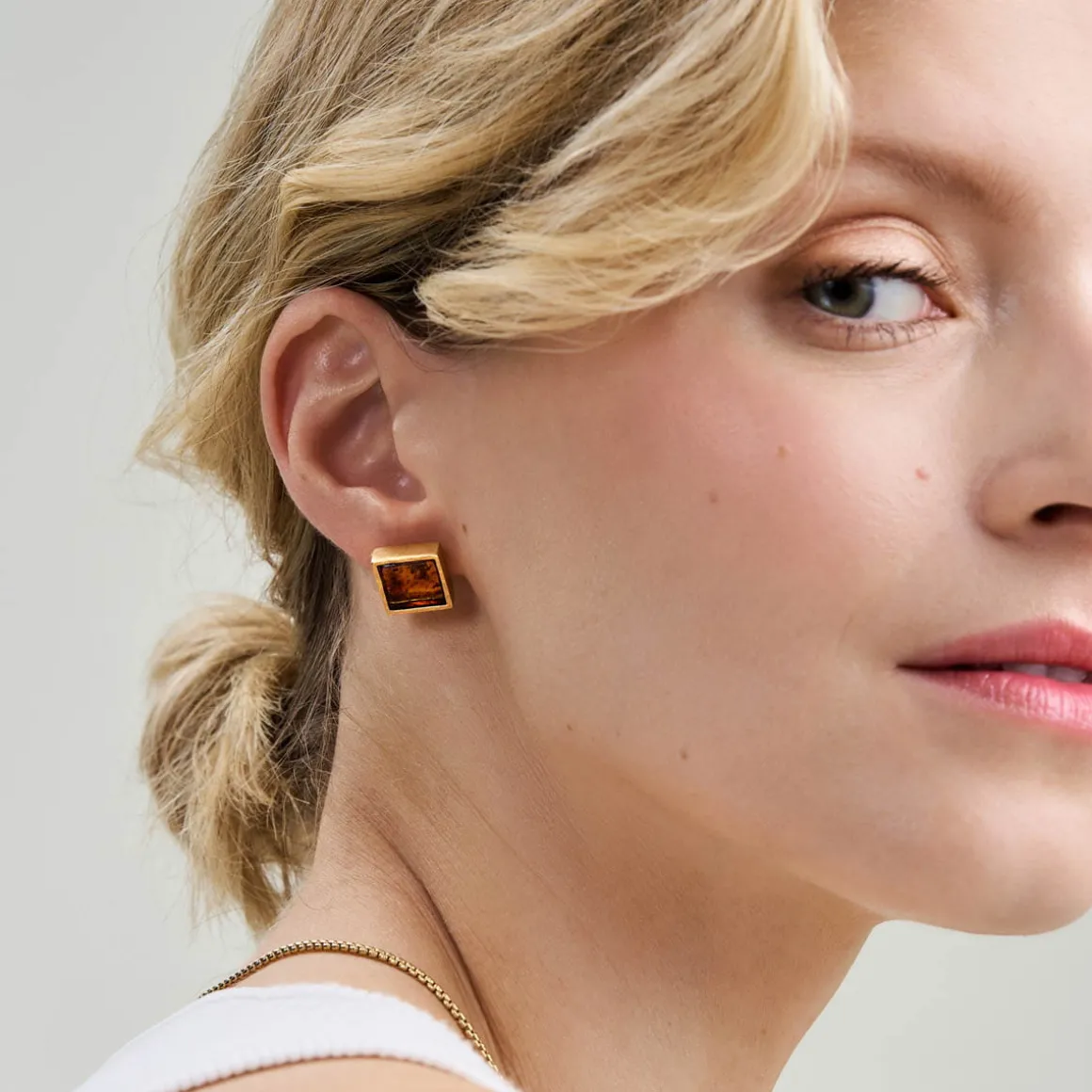 Subtelne, kwadratowe kolczyki na sztyfcie z bursztynami