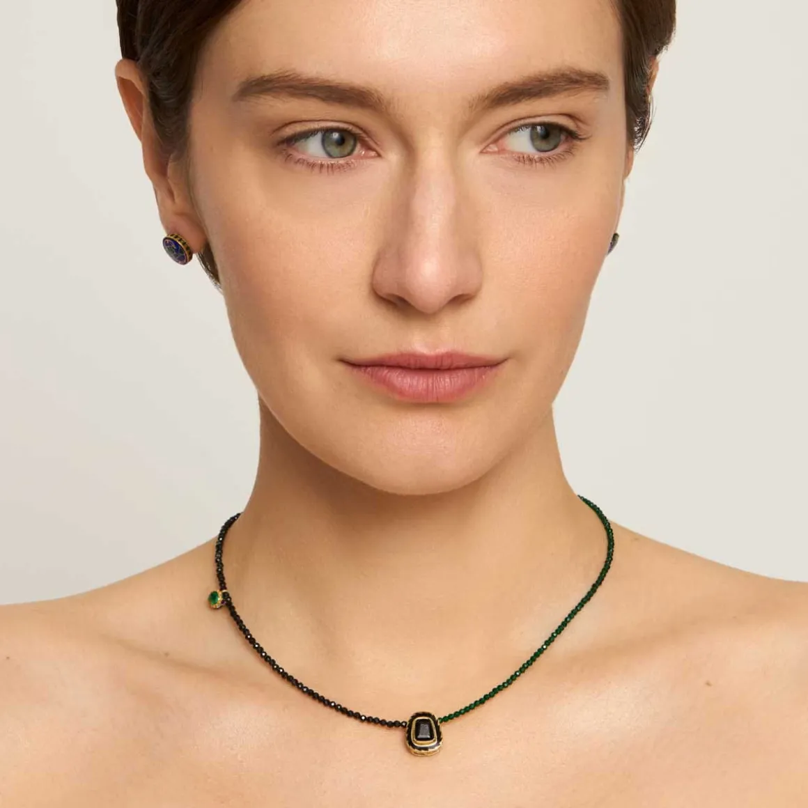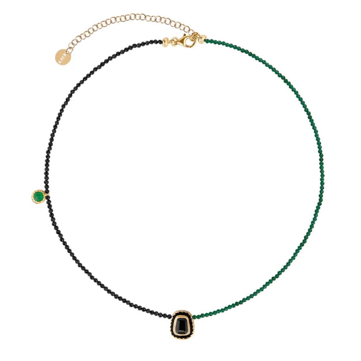 Krótki naszyjnik powstał w pracowni ORSKA z pozłacanego srebra i kolorowych kamieni. W połowie naszyjnik wykonany jest z cyrkonii w kolorze ciemnej zieleni, w połowie z fasetowanych czarnych onyksów. Kamienie łączy po środku ozdobna zawieszka zdobiona z każdej strony wykonana w Radżastanie przez zaprzyjaźnionych rzemieślników, których Anna Orska poznała w trakcie projektowej podróży do Indii. Na jednej z nich centrycznie umieszczono czarne kundan glass, czyli tradycyjne indyjskie szkło, które zostało otoczone pozłacanym srebrem oraz zdobieniami z czarnej emalii. Na odwrocie zawieszki namalowany został czarno-złoty ornament w formie kwiatu nagietka. Naszyjnik jest asymetryczny – na jego boku pomiędzy onyksami przewleczono dodatkową zawieszkę z centralnie osadzonym zielonym kundan glass, którego oprawa została pokryta misternymi zdobieniami z zielono-niebieskiej emalii. Asymetria nadaje naszyjnikowi artystycznego, nieszablonowego charakteru. To biżuteria dla tych, którzy nie boją się wyróżniać.