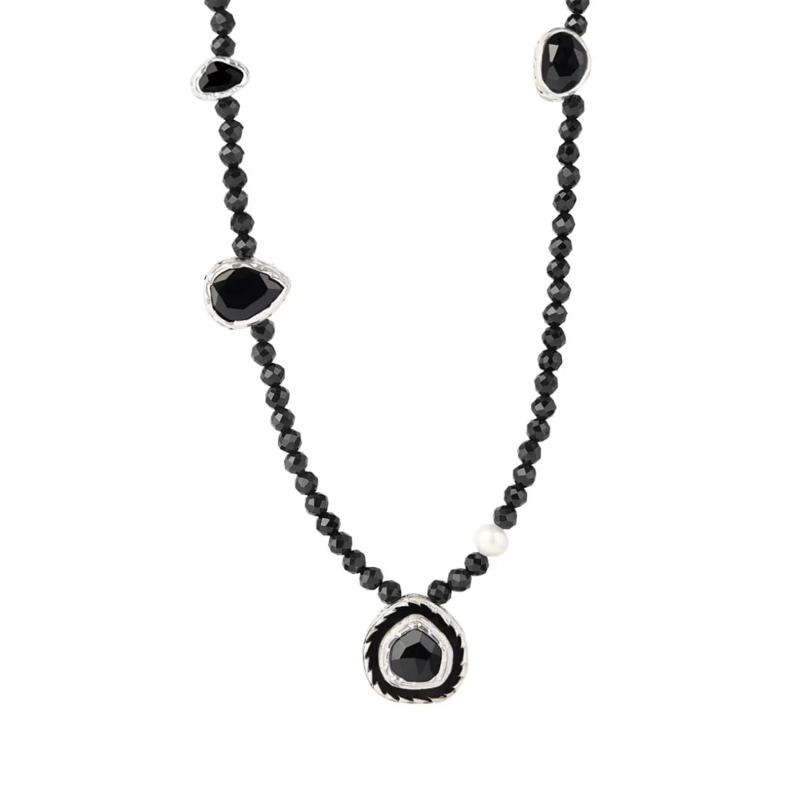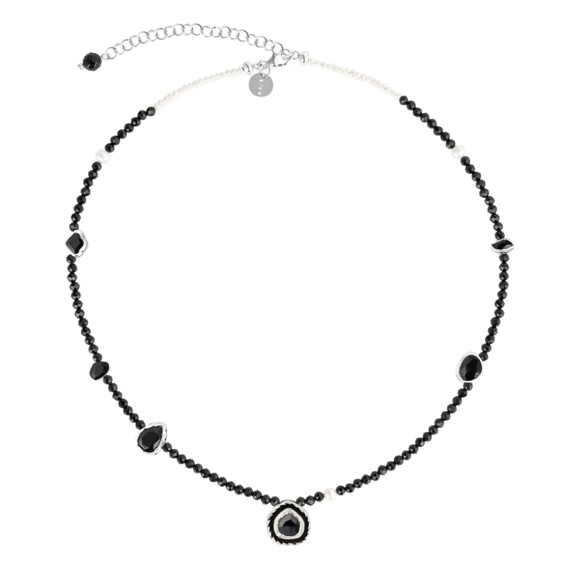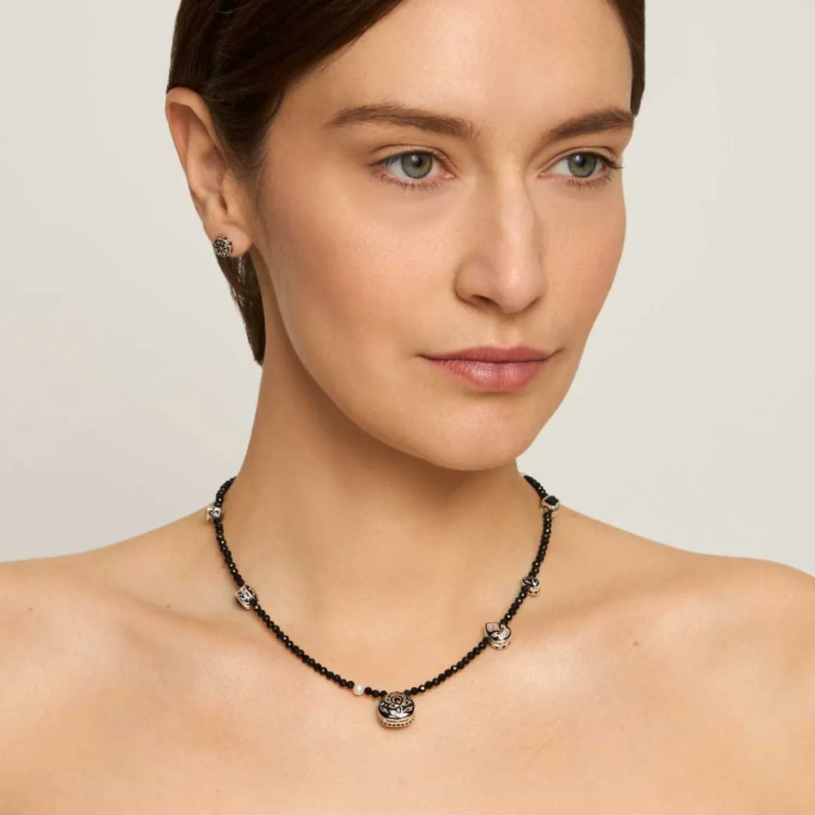 Efektowny naszyjnik powstał ze sznura fasetowanych onyksów, które tuż przy zapięciu dopełniają jasne drobne perły. Naszyjnik zdobi sześć dwustronnych srebrnych zawieszek. Z jednej strony zawieszki ozdobione są czarnymi i pudrowo-różowymi ornamentami roślinnymi wykonanymi przez indyjskich mistrzów z Radżastanu w technice minakari. Z drugiej strony zawieszki zdobione są czarnym kundan glass czyli wysokiej jakości szlifowanym szkłem indyjskim oprawionym w srebro. Kombinacja onyksów, pereł i emaliowanych zawieszek tworzy bogatą, wielowarstwową kompozycję.