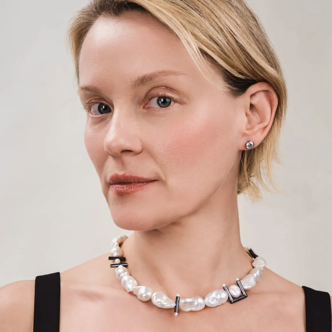 Unikatowa kolia powstała z nieregularnych pereł hodowlanych. Całość została przełamana różnorodnymi, minimalistycznymi elementami wykonanymi ze srebrnych rurek zamkniętych drobnymi perłami słodkowodnymi. Minimalistyczne wzornictwo biżuterii artystycznej zderzone z efektowną, kremową doskonałością pereł przedstawia współczesną interpretację kolii według projektantki. Wyrazisty naszyjnik jest bardzo efektowny. Świetnie sprawdzi się jako uzupełnienie wieczorowego stroju lub nietuzinkowy akcent casualowej stylizacji.