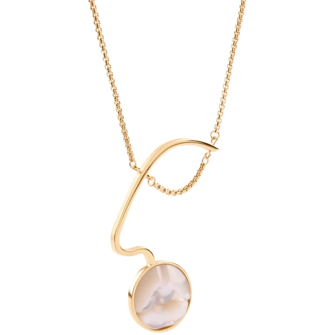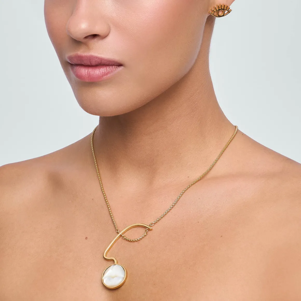 W pracowni ORSKA na delikatnym łańcuszku zawiesiliśmy geometryczną zawieszkę z pozłacanego mosiądzu. Jej centralnym elementem są mleczne usta wyrzeźbione w masie perłowej. Ciepły kolor pozłacanego metalu współgra z połyskującą perłową poświatą tworząc romantyczną kompozycję. Usta zostały dopełnione prostą, geometryczną formą, która imituje nos oraz oko uchwycone z profilu. Jej minimalizm kontrastuje z wydatnym i realistycznym kształtem rzeźbionych ust, tworząc intrygujący zestaw. Naszyjnik jest regulowany i można go nosić na dwóch różnych wysokościach. Masa perłowa jest materiałem naturalnym i poszczególne naszyjniki mogą nieco różnić się od siebie.