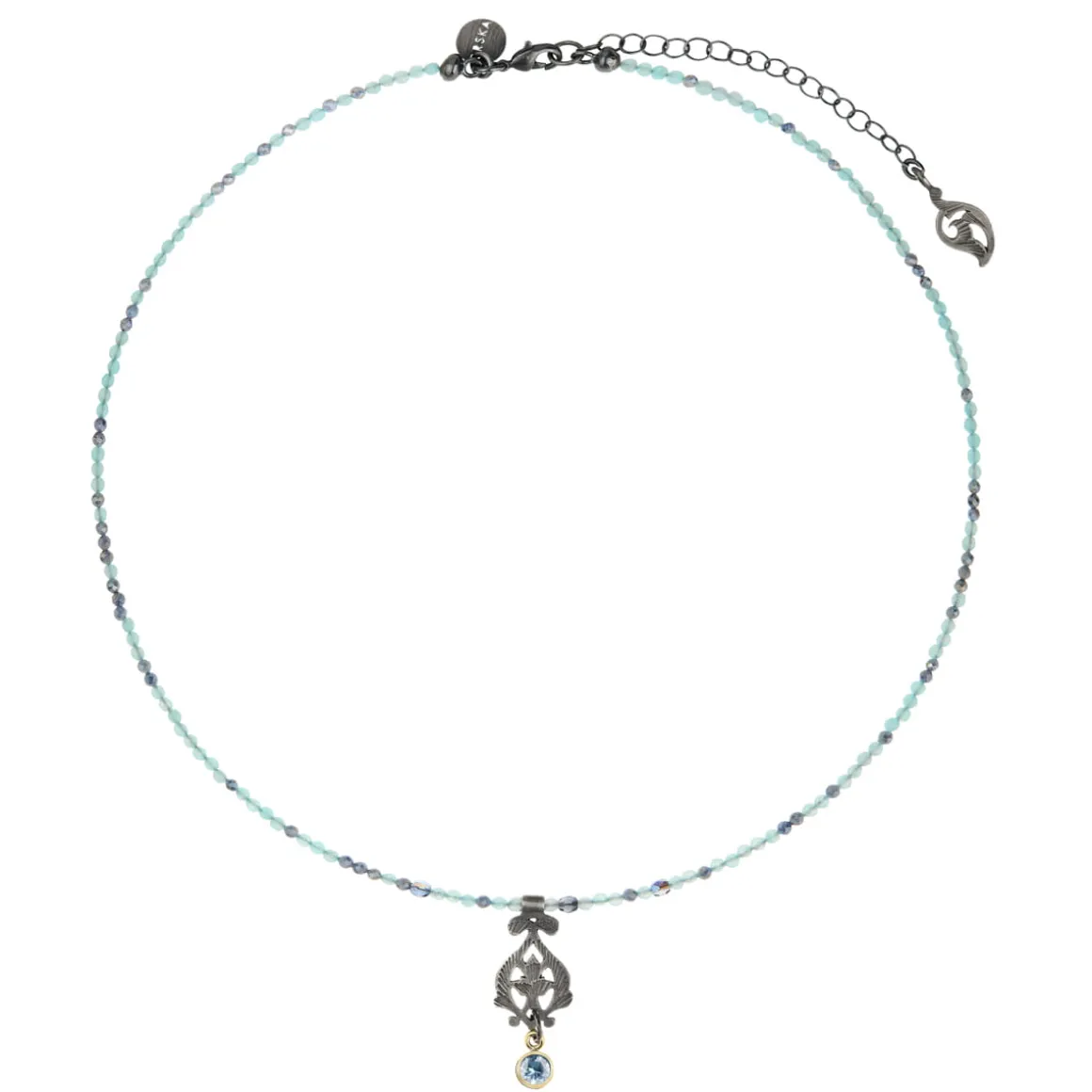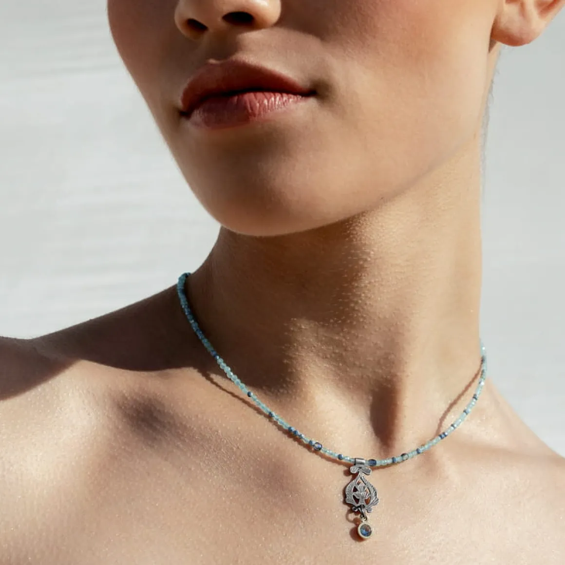 Krótki naszyjnik został wykonany ręcznie z niebieskich kamieni naturalnych, oksydowanego srebra i cyrkonii zamkniętej w złotej, mosiężnej oprawie. Duża zawieszka na froncie oraz drobna przy zapięciu powstały w lokalnym, marokańskim warsztacie. Mistrzowie z Marrakeszu wycięli floralny wzór i nadali mu ażurową strukturę. Chcąc podkreślić grę światłocienia, w warsztacie ORSKA elementy te zostały oksydowane i zyskały grafitowy kolor kontrastujący z kamieniami w odcieniach błękitu. Całość zamknięta została zapięciem na karabińczyk, kilkucentymetrową przedłużką i niewielkim logotypem ORSKA.