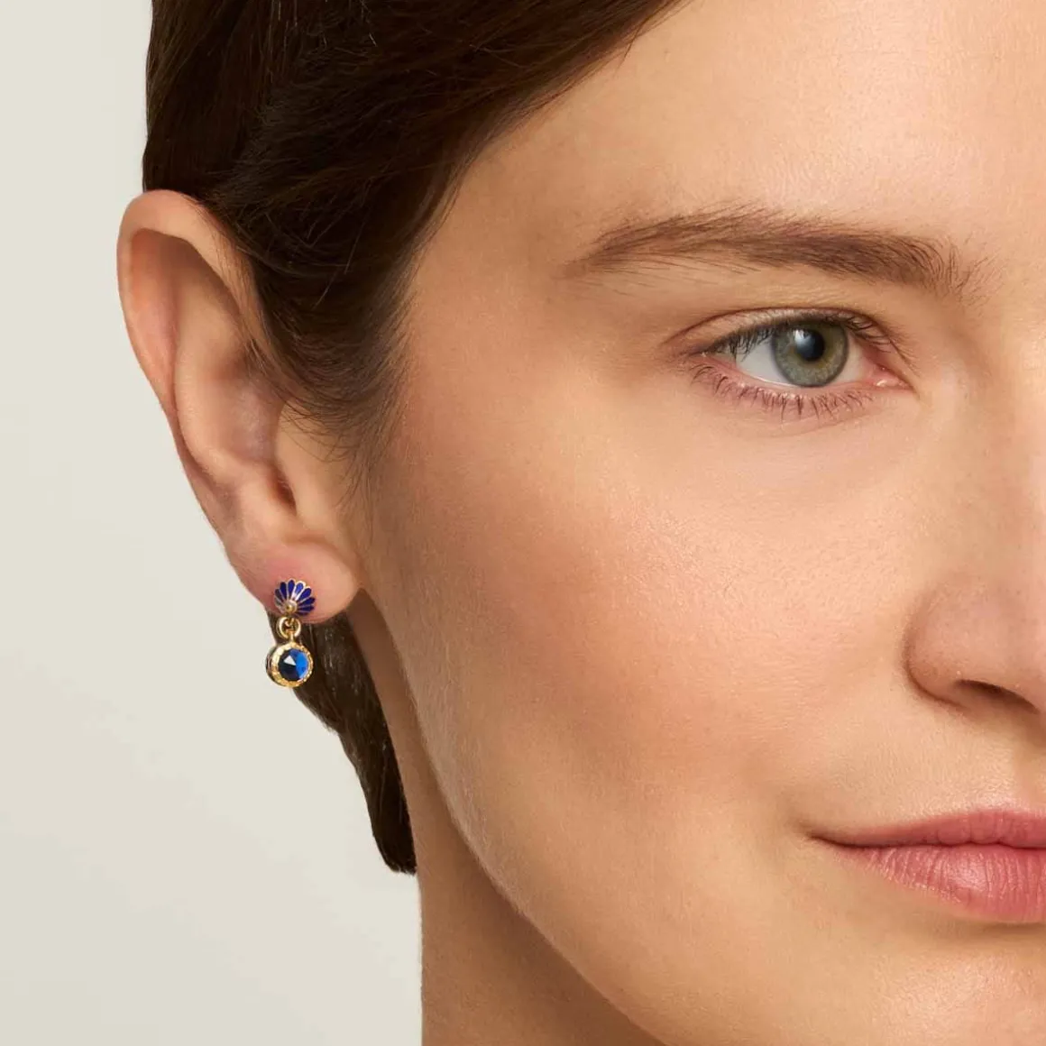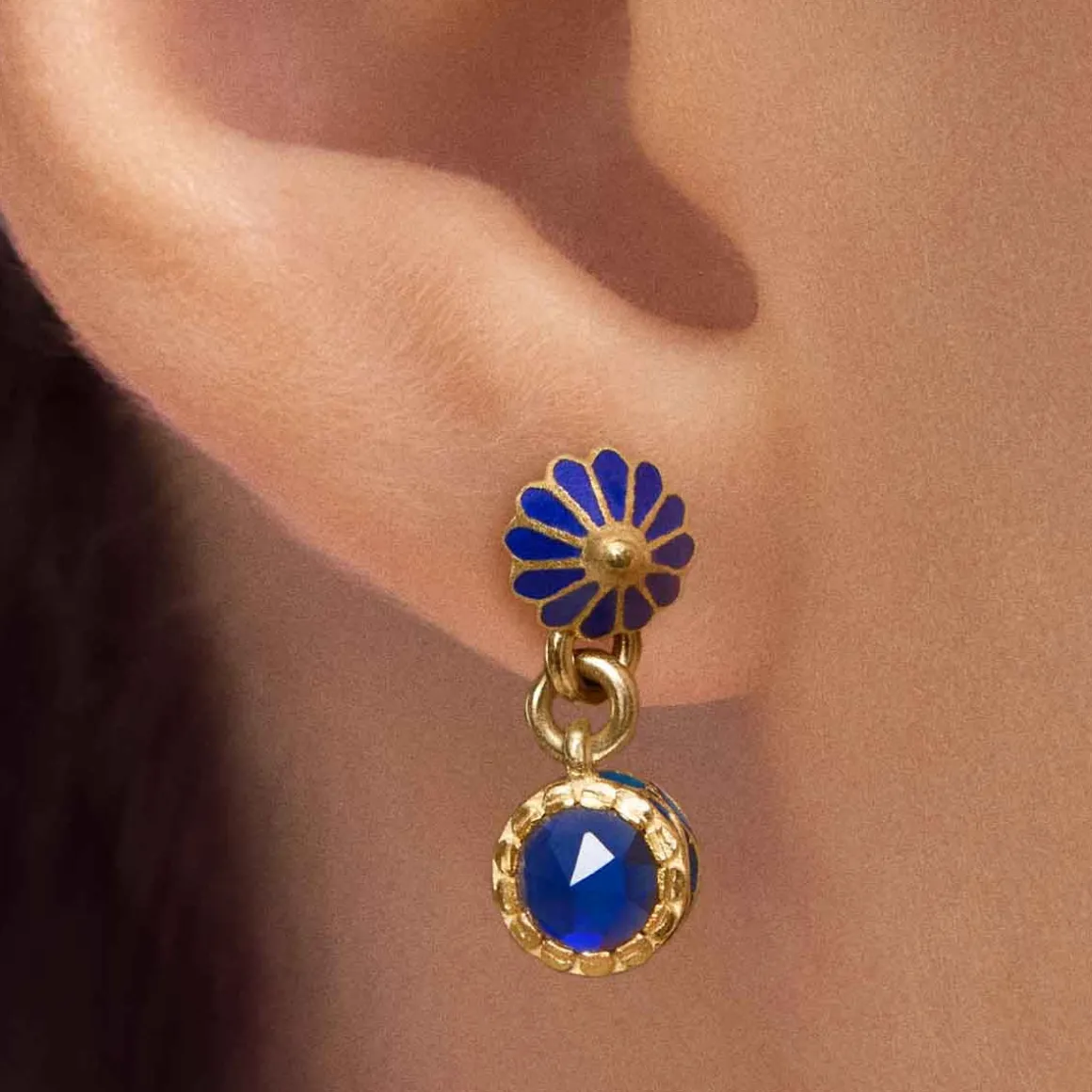 Kolczyki składają się z dwóch elementów: okrągłych rozet, do których przytwierdzone są sztyfty oraz bogato zdobionych zawieszek. Centrum rozety jest złote, a ku brzegom rozpościerają się ręcznie malowane wzory w kolorze indygo, kształtem przypominające płatki kwiatu. Do rozety przymocowano ozdobną zawieszkę, w której centrum znajduje się kundan glass – szklany kamień oprawiony w srebro pozłacane. Kundan glass w tej parze kolczyków ma intensywny niebieski kolor i fasetowaną powierzchnię, która odbija światło. Brzegi zawieszki zdobi minakari czyli emalia mineralna w odcieniach zieleni i błękitu, nakładana warstwami i wypalana w piecu. Kolczyki możesz nosić w dwóch wersjach: krótszej lub dłuższej. Jeśli chcesz uzyskać delikatne kolczyki na sztyfcie wystarczy, że odepniesz wiszące zawieszki.
