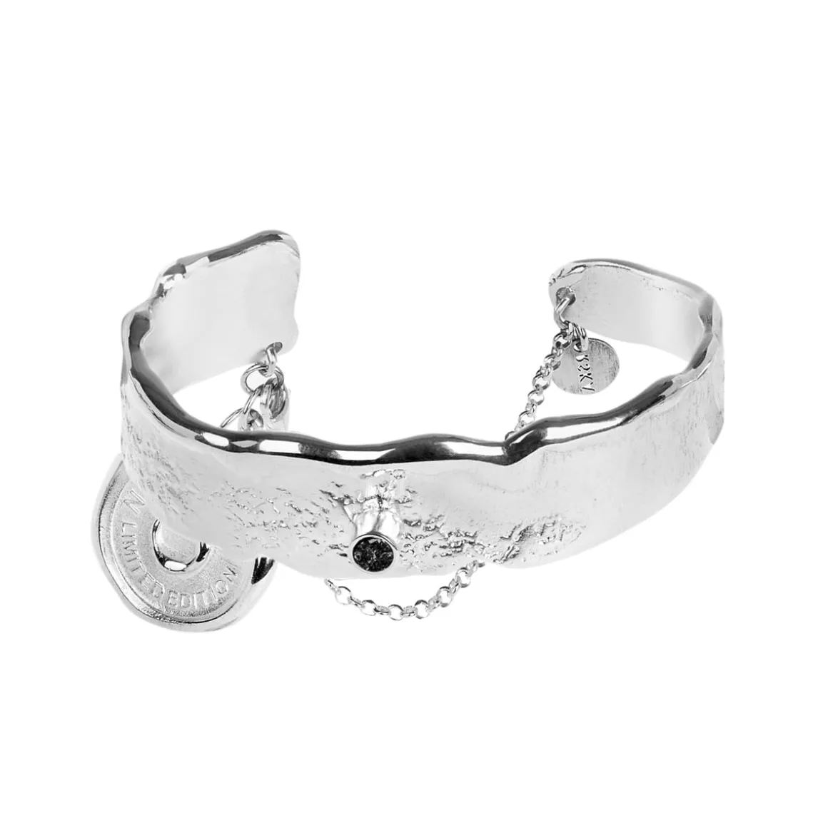 Surowa, falowana forma jako pierwsza rzuca się w oczy w bransolecie z kolekcji New Stone. Nieregularne wykończenie i błyszczące brzegi bransoletki przypominają naturalne powierzchnie skał widocznych pośród fal. Z tej spokojnej metalicznej toni wyłania się centralnie umieszczony ciemny kamień. Zdobiące go opiłki srebra pochodzą z pracowni ORSKA i są odpadem po procesie obróbki metalu. Srebrna bransoletka została opatrzona pieczęcią “made by Homo Sapiens”, która przypomina o pochodzeniu kamienia.
