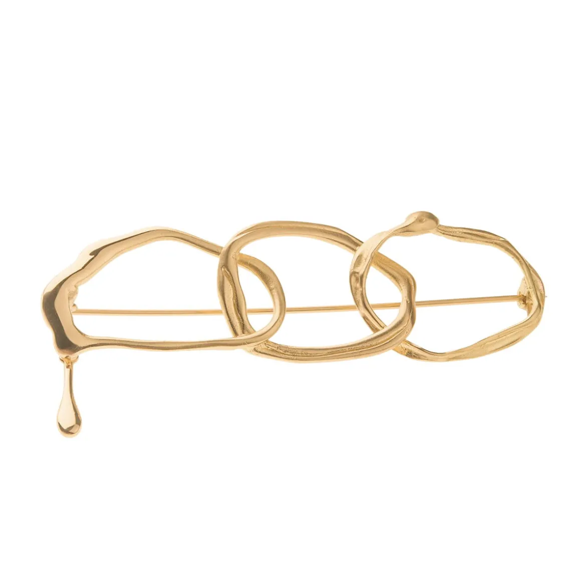 Broszka z kolekcji New Stone została wykonana ręcznie z pozłacanego mosiądzu. Trzy okręgi o nieregularnym kształcie zostały ze sobą połączone, dzięki czemu utworzyły interesującą formę, która przyciąga uwagę. Surowa, nieidealna faktura mosiądzu przywodzi na myśl skojarzenia naturalnych, chropowatych powierzchni skalnych, co podkreśla niebanalny charakter całości. Finezyjna broszka sprawdzi się zarówno w casualowych jak i wieczorowych stylizacjach.