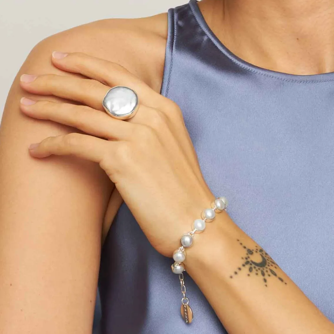 Pierścionek wykonany został ze srebra próby 925. Na froncie szerokiej obrączki umieszczono okrągłą perłę o nieregularnej powierzchni. Oprawa została stworzona w taki sposób, aby dopasować się do naturalnych zagłębień i załamań na powierzchni perły. Dzięki temu srebro delikatnie otula kamień, podkreślając jego organiczną formę. Każda perła opowiada własną historię powstawania – zapisaną w wypukłościach i mikrostrukturach przypominających linie papilarne. Nie ma dwóch identycznych naturalnych pereł, a zatem każdy egzemplarz pierścionka jest unikatowy. Perły delikatnie różnią się kształtem i odcieniem od egzemplarza przedstawionego na zdjęciu, co dodatkowo podkreśla unikalny charakter biżuterii z tej kolekcji.