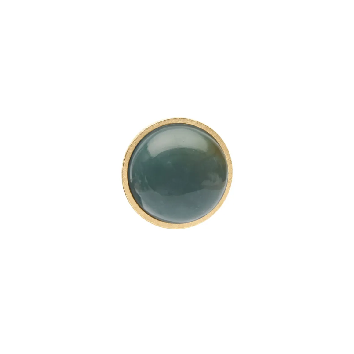 Pin został wykonany ręcznie w pracowni ORSKA z pozłacanego mosiądzu, a jego sercem jest ręcznie szlifowany ciemnozielony jadeit o okrągłym kształcie. Brzegi mosiężnej ramy mają szczotkowane wykończenie kontrastujące z połyskiem kamienia. Minimalistyczna, geometryczna forma podkreśla naturalny blask jadeitu. Każdy egzemplarz jest unikatowy ze względu na nieregularne inkluzje i różne odcienie naturalnych kamieni. Pin zapinany jest na wygodny zacisk, który umożliwia wiele opcji stylizacji. W kolekcji pin występuje również w wersji z jasnozielonym kamieniem.