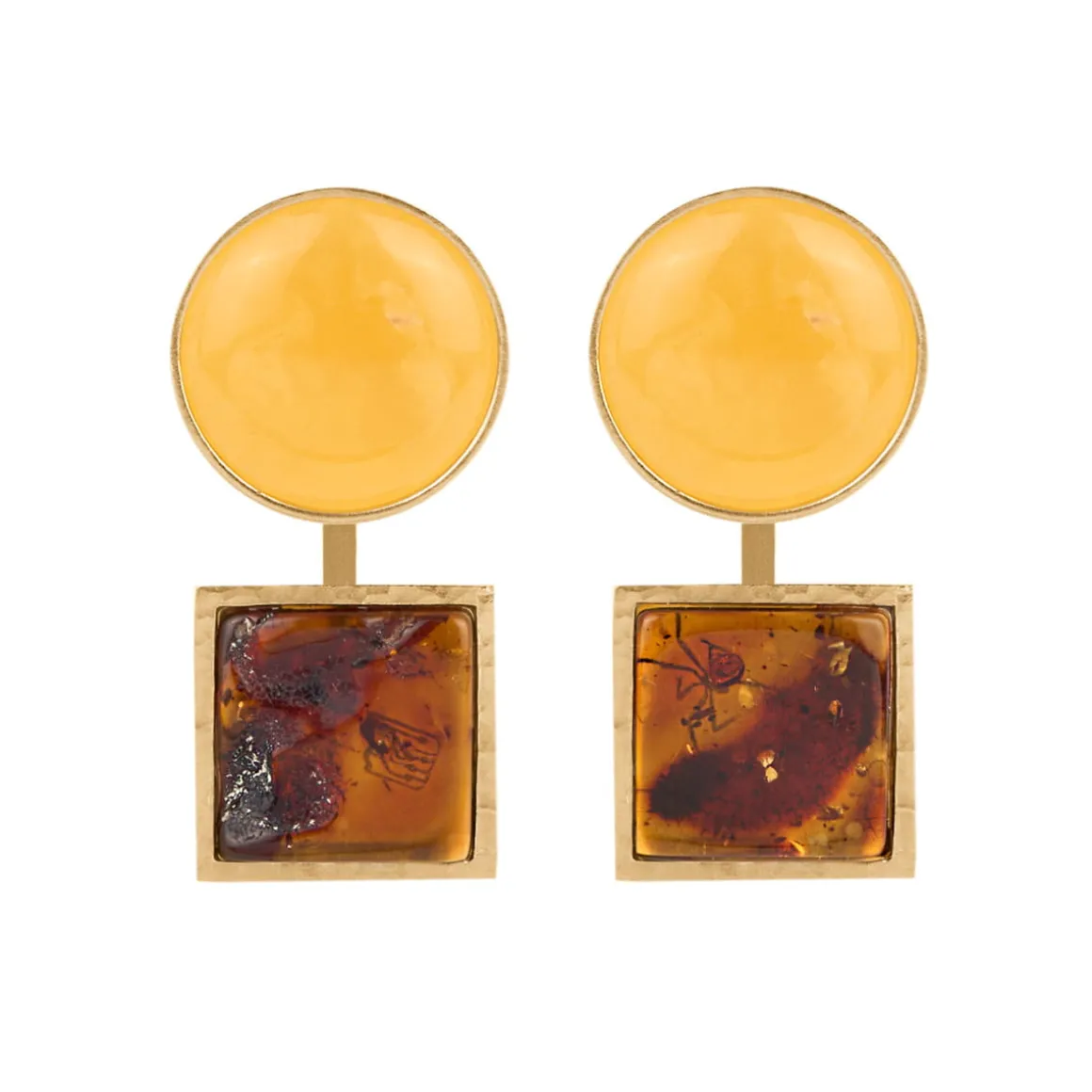 Efektowne kolczyki stworzyliśmy ręcznie w manufakturze ORSKA. Pozłacane formy ukształtowaliśmy w geometryczne kompozycje i ozdobiliśmy dwoma bursztynami, zestawionymi ze sobą na zasadzie kontrastu. Okrągły, cytrynowy bursztyn, zamknięty w oprawie o satynowej powierzchni, umieściliśmy na sztyfcie wykonanym z pozłoconego srebra. Niżej, na geometrycznym mocowaniu, umieściliśmy kwadratowy, transparentny bursztyn w ciemniejszym, koniakowym kolorze oprawiony w kuty pozłacany mosiądz. Przez przejrzyste bursztyny można dostrzec grawerunek naturalnych inkluzji (mały pająk na jednym kolczyku) oraz współczesnych artefaktów ludzkiej działalności (na drugim kolczyku). Bursztyny nieznacznie różnią się między sobą kolorem, dlatego każdy egzemplarz jest unikatowy.