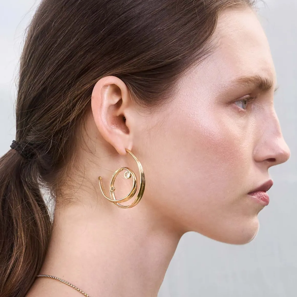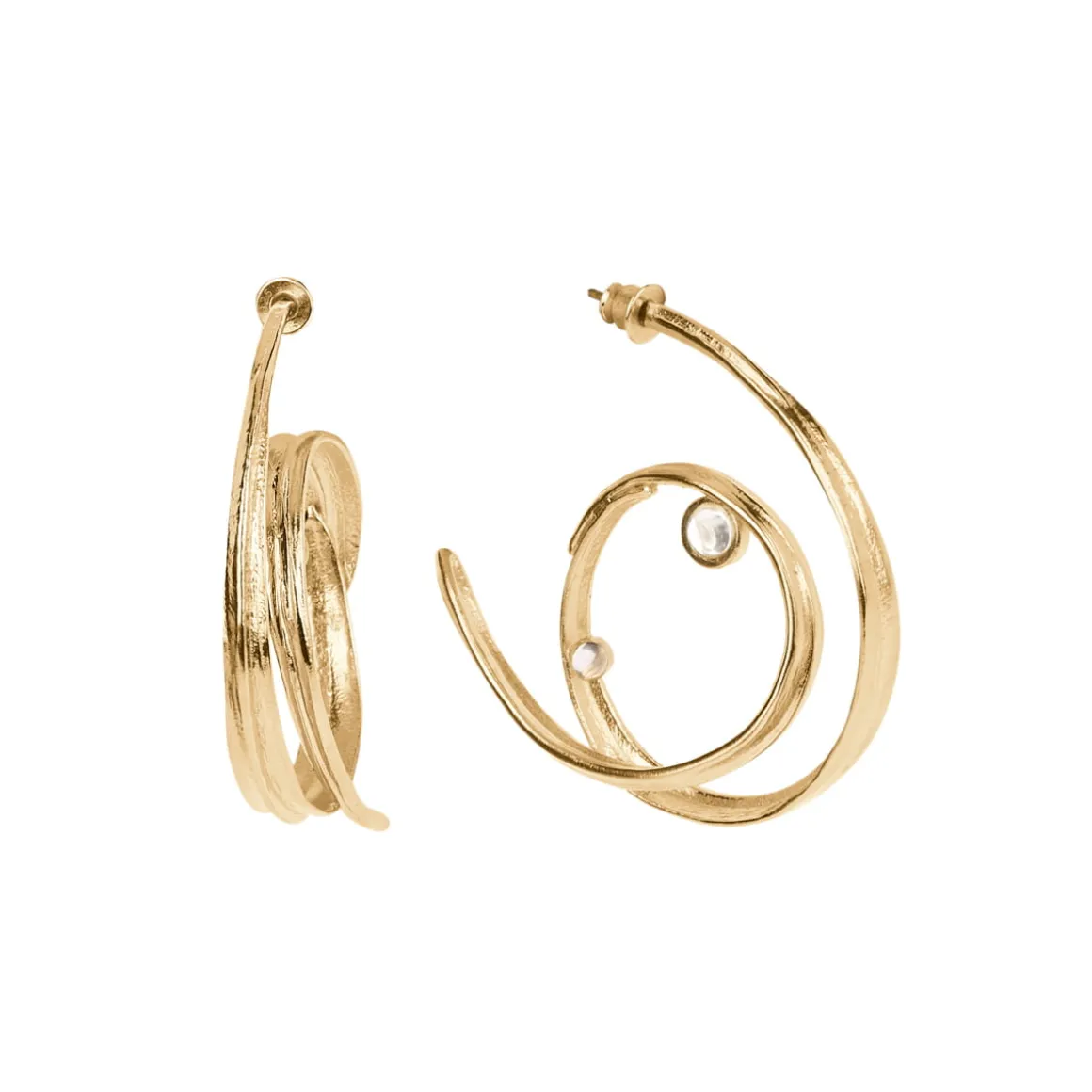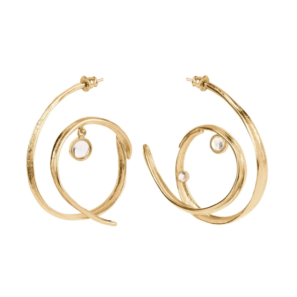 Asymetryczne kolczyki wykonaliśmy ręcznie z pozłacanego mosiądzu. Każdy kolczyk ma formę spirali, która symbolizuje ciągłość i cykliczność natury. Delikatne kryształy górskie, umieszczone w centrum spirali, są idealnie transparentne. Ze względu na swój kształt i klarowność przypominają krople rosy. Złocenie mosiądzu nadaje kolczykom eleganckiego wyglądu, podczas gdy organiczny kształt spirali przywodzi na myśl naturalne formy i struktury. Ta asymetryczna para kolczyków wyróżnia się artystycznym designem, nowocześnie interpretując formy inspirowane naturą.