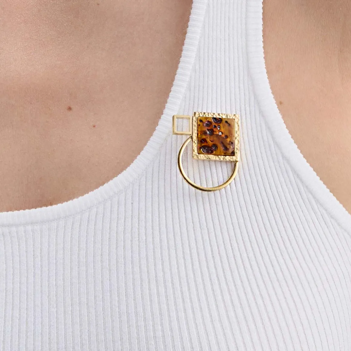 Pin z kolekcji Baltica wykonaliśmy ręcznie z pozłacanego mosiądzu i bursztynu. Centralnym elementem biżuterii jest naturalny, częściowo przejrzysty bursztyn, który umieściliśmy w oprawie o kutej powierzchni. Złoty kamień w kształcie kwadratu zestawiony z okrągłą formą metalu nadaje całości nowoczesnego charakteru. Lekka, ażurowa konstrukcja oraz zapięcie na zacisk gwarantują wygodę użytkowania. Elegancka biżuteria łączy w sobie surowość ręcznej obróbki z delikatnością naturalnego bursztynu, tworząc wyjątkowy dodatek o wyrazistym designie.