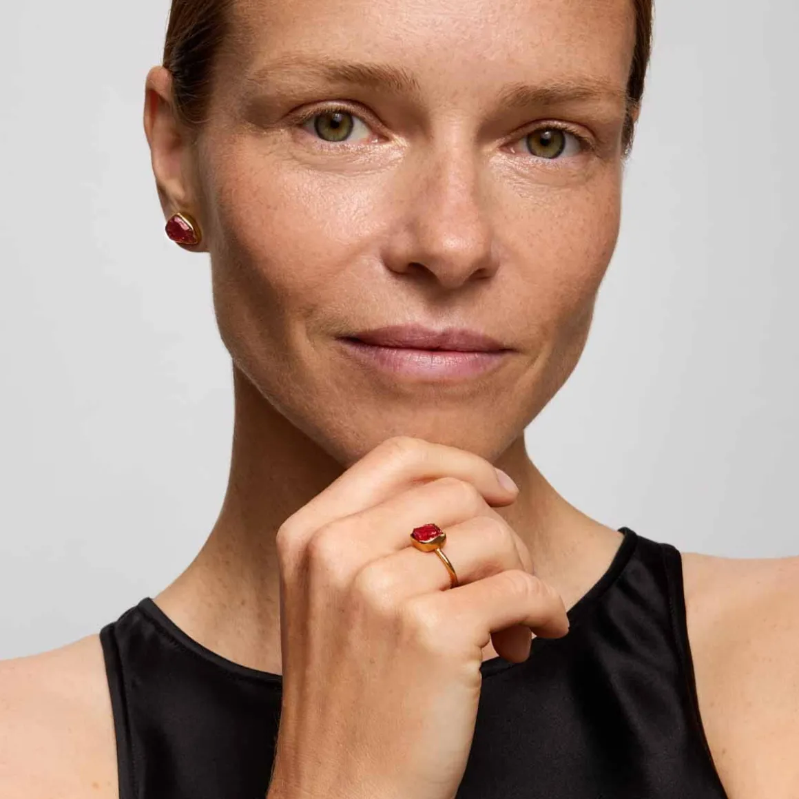 Pierścionek z kolekcji Aurora został ręcznie wykonany z pozłacanego srebra próby 925. Jego sercem jest duży, surowy turmalin w odcieniach różu umocowany na delikatnej, cienkiej obrączce. Każdy kamień jest inny i ma oryginalną kolorystykę od subtelnego pudrowego po głęboką malinę. Nieregularna, łupana forma kamienia podkreśla jego naturalne piękno. Nasze turmaliny pochodzą z Radżastanu, gdzie łupano je i obrabiano w niewielkim rodzinnym warsztacie. Anna Orska poznała jego właścicieli w trakcie podróży projektowej do Indii. Każda bryłka została indywidualnie oprawiona. To wyjątkowe podejście wyróżnia kolekcję, bo w jubilerstwie zazwyczaj stosuje się ustandaryzowane oprawki.