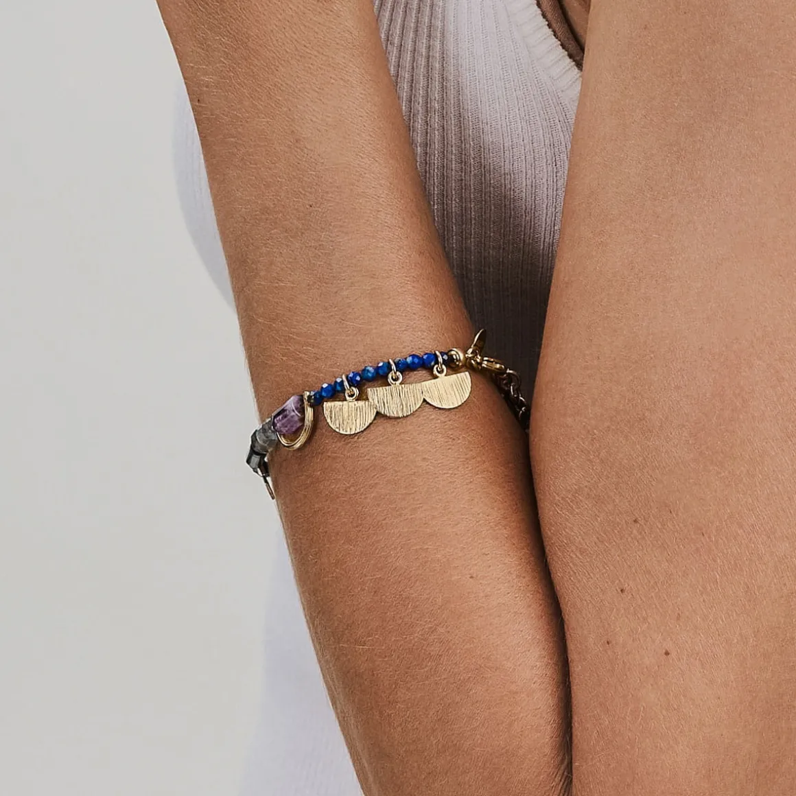 Inspirowana letnim przebudzeniem i wakacyjną radością artystyczna biżuteria z kolekcji Gelato pełna jest energetycznych kolorów, które wybrane zostały nieprzypadkowo. Anna Orska sięgnęła do egzotycznych fascynacji ośrodkami energii i zinterpretowała dobre wibracje w biżuterii z nutką boho. Delikatna, ręcznie wykonana bransoletka powstała dzięki połączeniu minerałów w stonowanych kolorach, takich jak lapis lazuli, ametystu, sodalitu i azurytu, z geometrycznymi zawieszkami. Dodatkowo, bransoletka ozdobiona została dwoma drobnymi wisiorami w kształcie inspirowanym czakrą trzeciego oka. Jej atrybutami są: intuicja, sprawna pamięć krótkotrwała, spostrzegawczość oraz koncentracja. Chcąc rozwinąć czy unormować ten ośrodek energii warto medytować skupienie na punkcie, kontemplować piękne widoki, malować (niezależnie od zdolności), oraz wsłuchiwać się w swój wewnętrzny głos. Oryginalna biżuteria w subtelnym kolorze wywołując uśmiech na twarzy, przypomina o istotnej roli równowagi w naszym życiu.