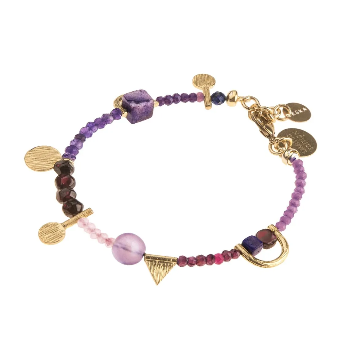 Kamienie użyte w bransoletce: lapis lazuli, granat, ametyst, jaspis, kwarc różowy.