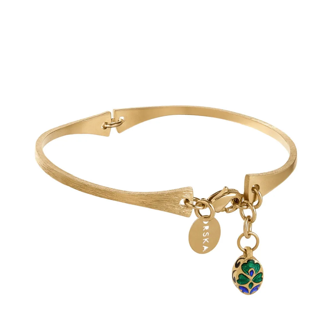 Bransoletka wykonana z pozłacanego srebra powstała w pracowni ORSKA z dwóch sztywnych łuków o kontrastującym wykończeniu powierzchni, połączonych delikatnym ogniwem i tworzących lekką, geometryczną formę. Całość uzupełnia regulowana przedłużka zakończona ozdobną zawieszką z barwnym wzorem. Z jednej strony zawieszki zielono-niebieskie ornamenty układają się w motyw liści – symbol więzi, tradycji i ciągłości. W indyjskiej symbolice liście i pnącza oznaczają trwałe połączenie z naturą oraz rytm powtarzających się cykli życia. Druga strona zdobiona jest kwiatowym motywem z kolorowej emalii, w którym zieleń symbolizuje harmonię, a błękit – wewnętrzny spokój. Brzegi zawieszki dopełniają geometryczne ornamenty z czarnej emalii, nadając całości wyrafinowany, artystyczny charakter. Bogato zdobione elementy wykonane zostały w warsztacie w Radżastanie, który Anna Orska odwiedziła w trakcie wyprawy w poszukiwaniu ciekawych rzemiosł świata.