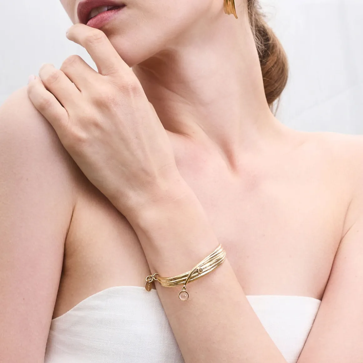 Bransoletka została wykonana ręcznie w pracowni ORSKA z pozłacanego mosiądzu. Na sztywnej obręczy precyzyjnie odwzorowano strukturę trawy. Dzięki temu złote źdźbła wyglądają jak przyniesione do domu wprost ze słonecznej łąki. Całość zdobią dwa naturalne kryształy górskie, które nasuwają skojarzenia z kroplami rosy. Choć bransoletka łatwo wsuwa się na nadgarstek, została dodatkowo zabezpieczona łańcuszkiem zakończonym karabińczykiem.