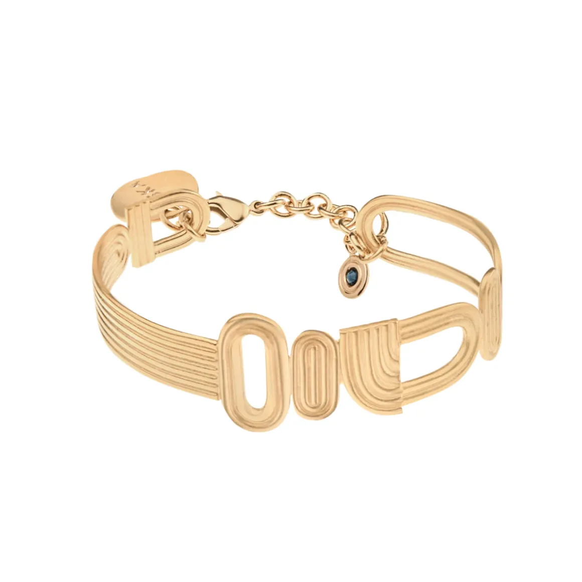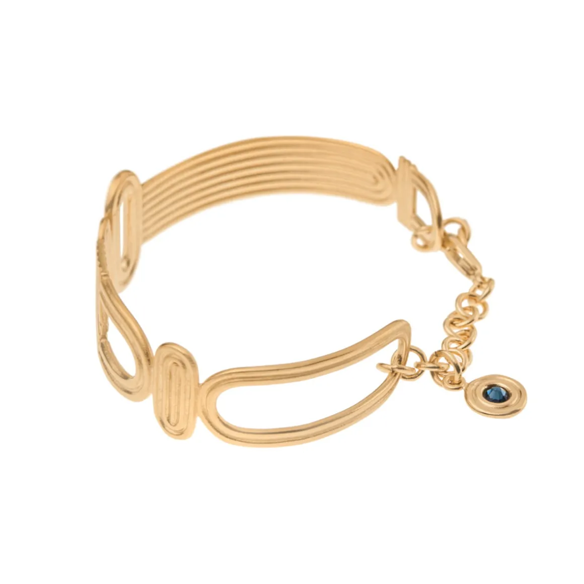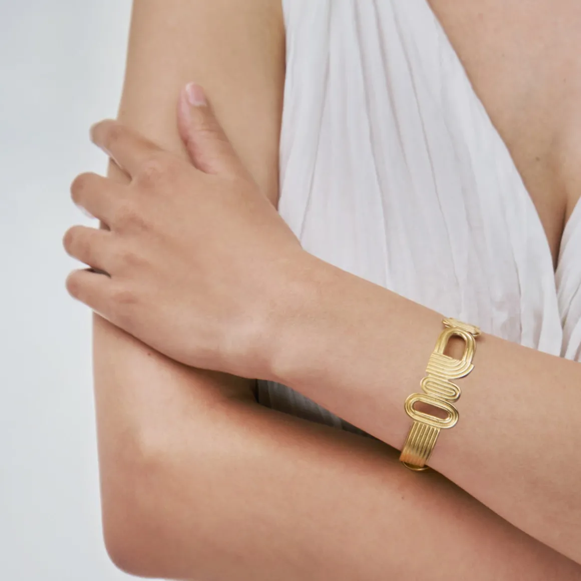 Bransoletka została wykonana ręcznie z pozłacanego mosiądzu. Geometryczne elementy tworzą sztywną obręcz uzupełnioną o łańcuszek z zapięciem na karabińczyk oraz logo ORSKA. Fantazyjne formy i linearne zdobienie oddają symbolikę żywiołów. Alegoria powietrza ma kształt nieustannie pędzącego łuku. Minimalistyczny symbol ziemi to nawiązanie do widoku pól z lotu ptaka. Natomiast niebieski kryształ nawiązuje do żywiołu wody. Biżuteria z kolekcji Holos, przedstawiając symboliczną współpracę żywiołów, zachęca byśmy docenili mozaikowość natury.