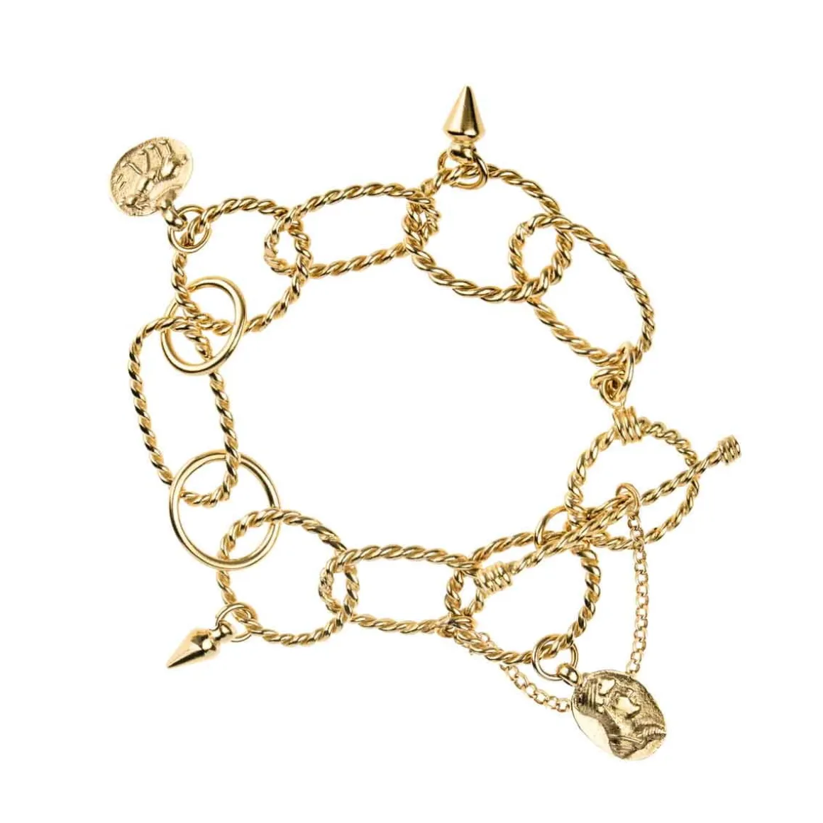 Bransoletkę wykonaliśmy ręcznie w pracowni jubilerskiej ORSKA z pozłacanego mosiądzu. Bransoletka składa się z owalnych i okrągłych elementów połączonych ze sobą w ozdobny łańcuch. Spiralnie skręcone ogniwa zestawiliśmy z ogniwami o gładkiej, satynowej powierzchni. Ta gra struktur sprawia, że całość jest intrygująca i przyciąga spojrzenia. Całość ozdobiliśmy dwoma zawieszkami w kształcie grotów strzał oraz dwoma drobnymi medalionami z symbolicznymi znakami. W zależności od egzemplarza, mogą się na nich pojawić różne symbole, od mitycznych zwierząt i postaci, po figury królów. Bransoletka zapinana jest na ozdobny skobel, który nie tylko umożliwia jej wygodne zapięcie, ale także jest elementem dekoracyjnym. Kompozycję bransoletki dopełnia małe logo ORSKA.